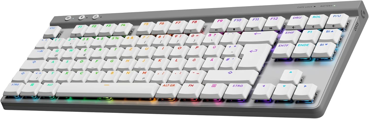 • Механична геймърска клавиатура: Logitech G515 LIGHTSPEED TKL се отличава с тънък профил, без цифров блок и предлага тройна свързаност: безжична технология LIGHTSPEED, Bluetooth или кабелен трансфер на данни.