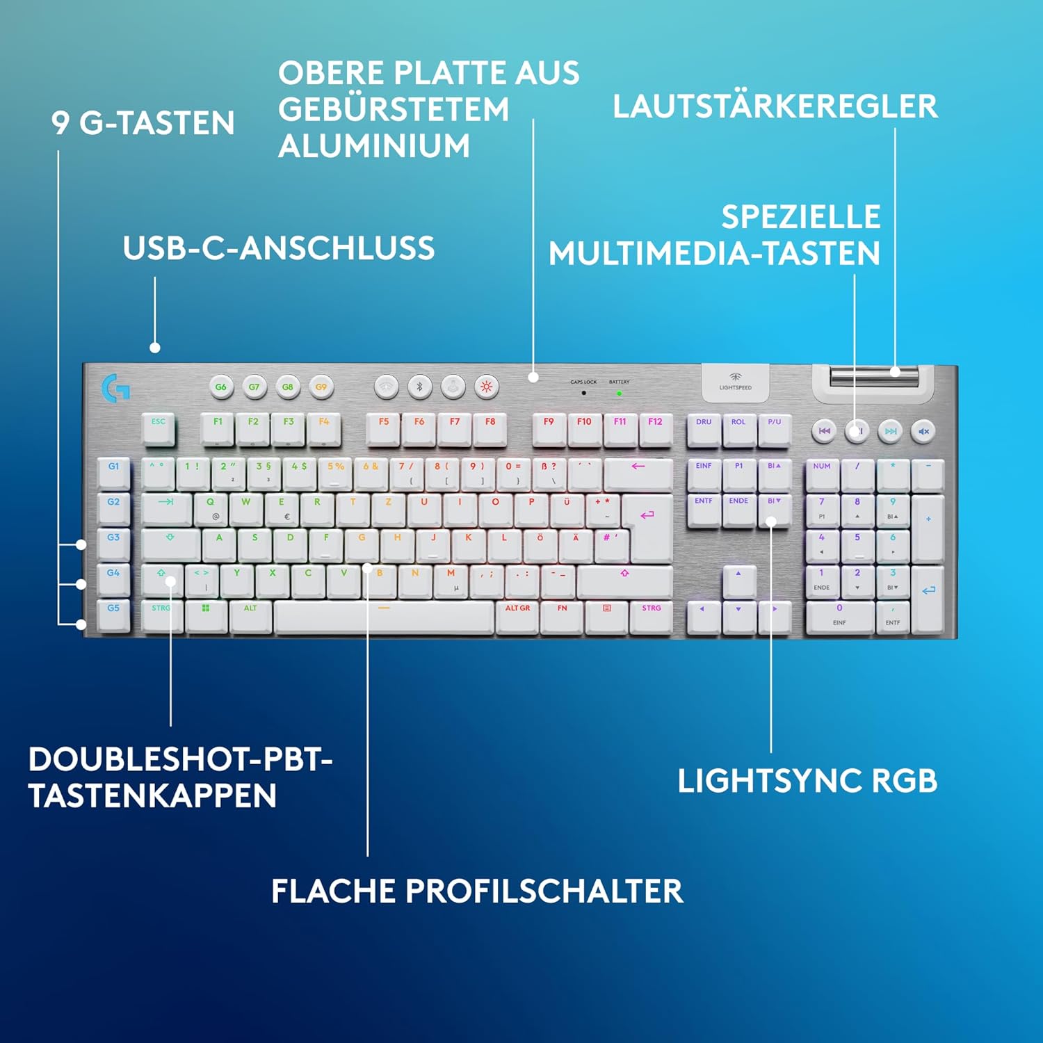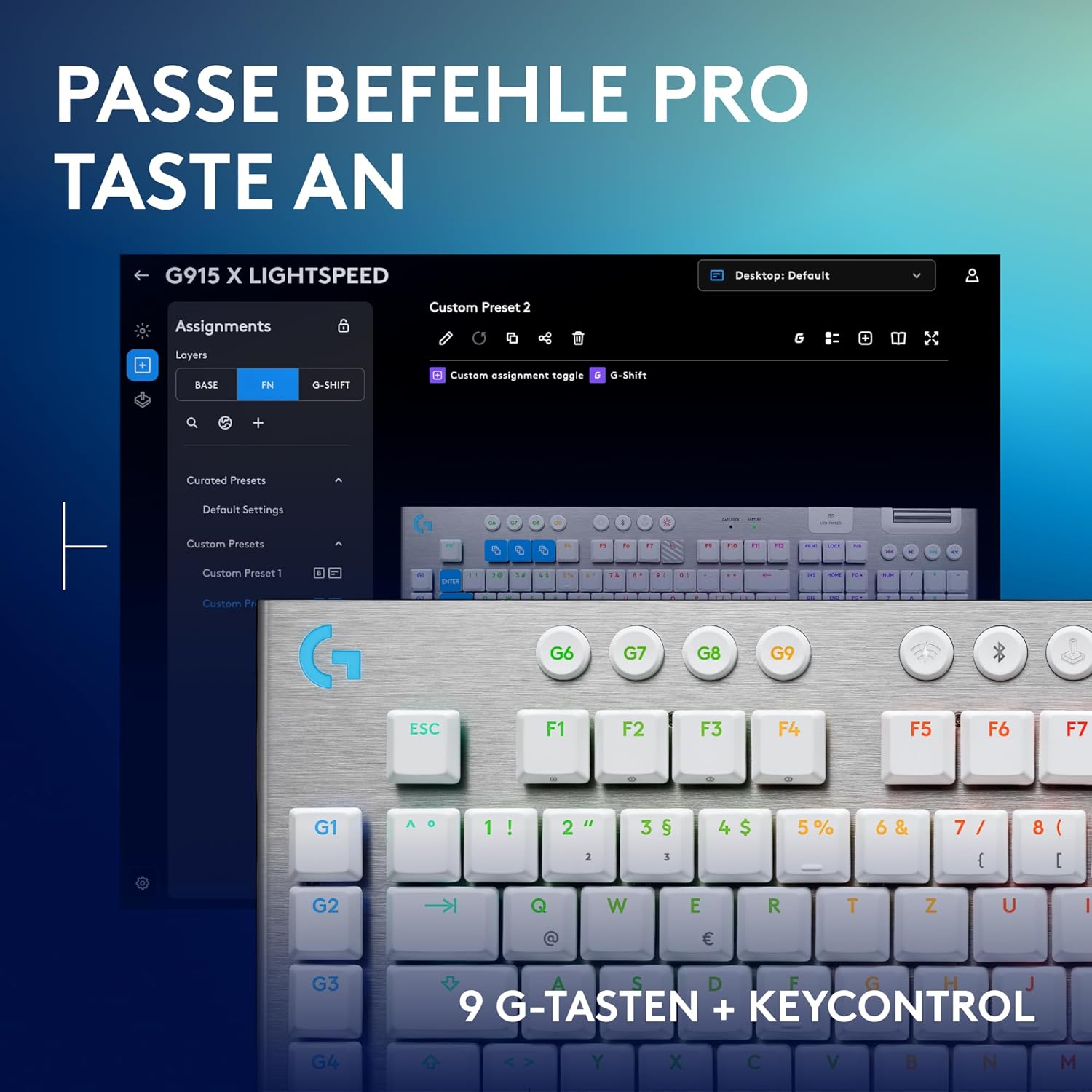 Геймърска безжична клавиатура Logitech G G915 X LIGHTSPEED с нисък профил, двойни PBT капачки, кафява тактилна, PC/Mac, DEU QWERTZ и G 502
