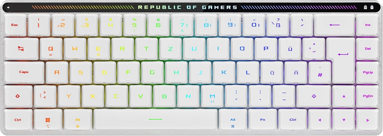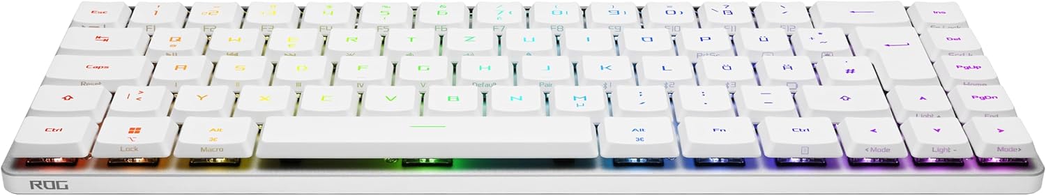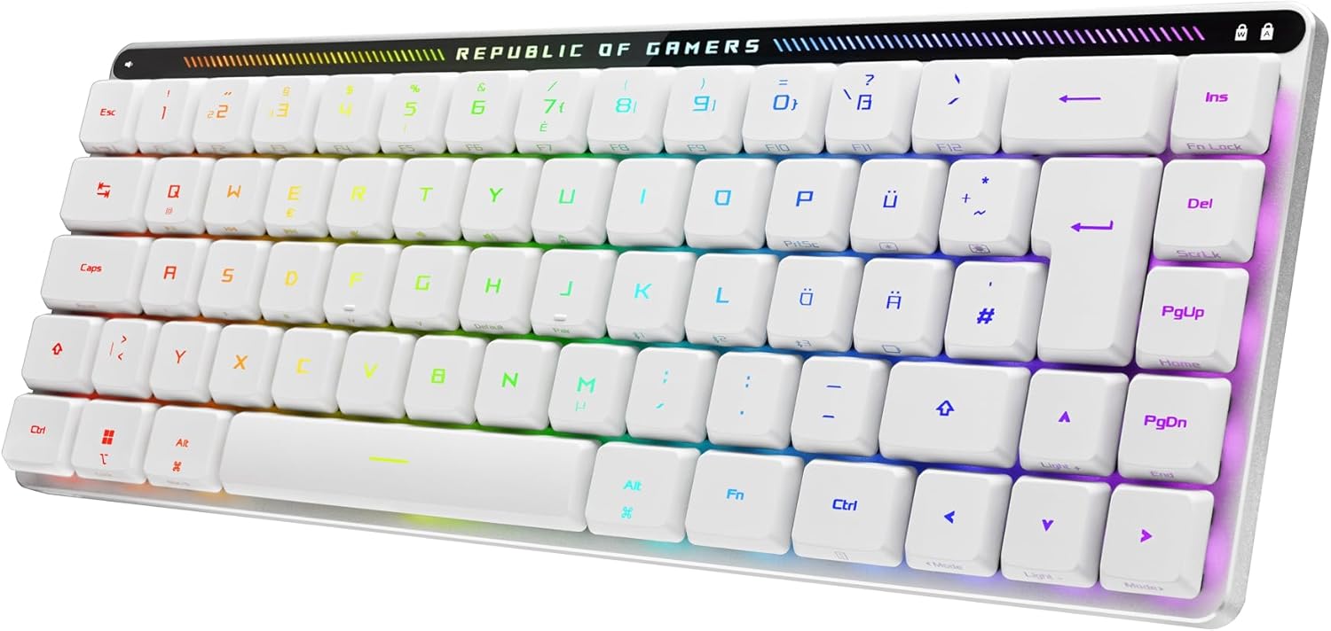 Геймърска клавиатура ASUS ROG Falchion RX Low Profile 65% Wireless (QWERTZ разположение, оптични ROG RX Low Profile превключватели, Bluetooth, 2.4GHz RF безжична връзка, кабелна USB, съвместима с MacOS, бяла)