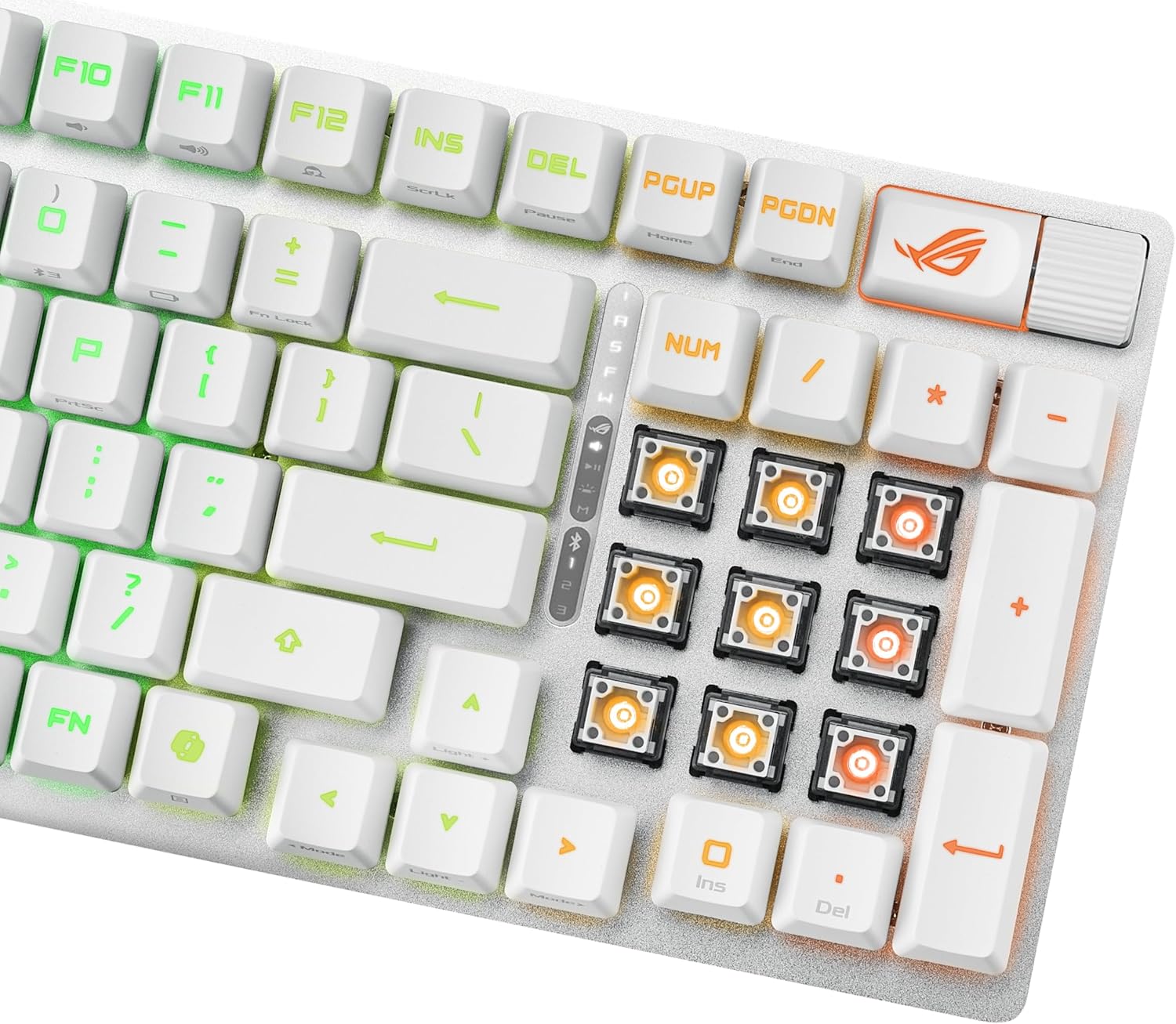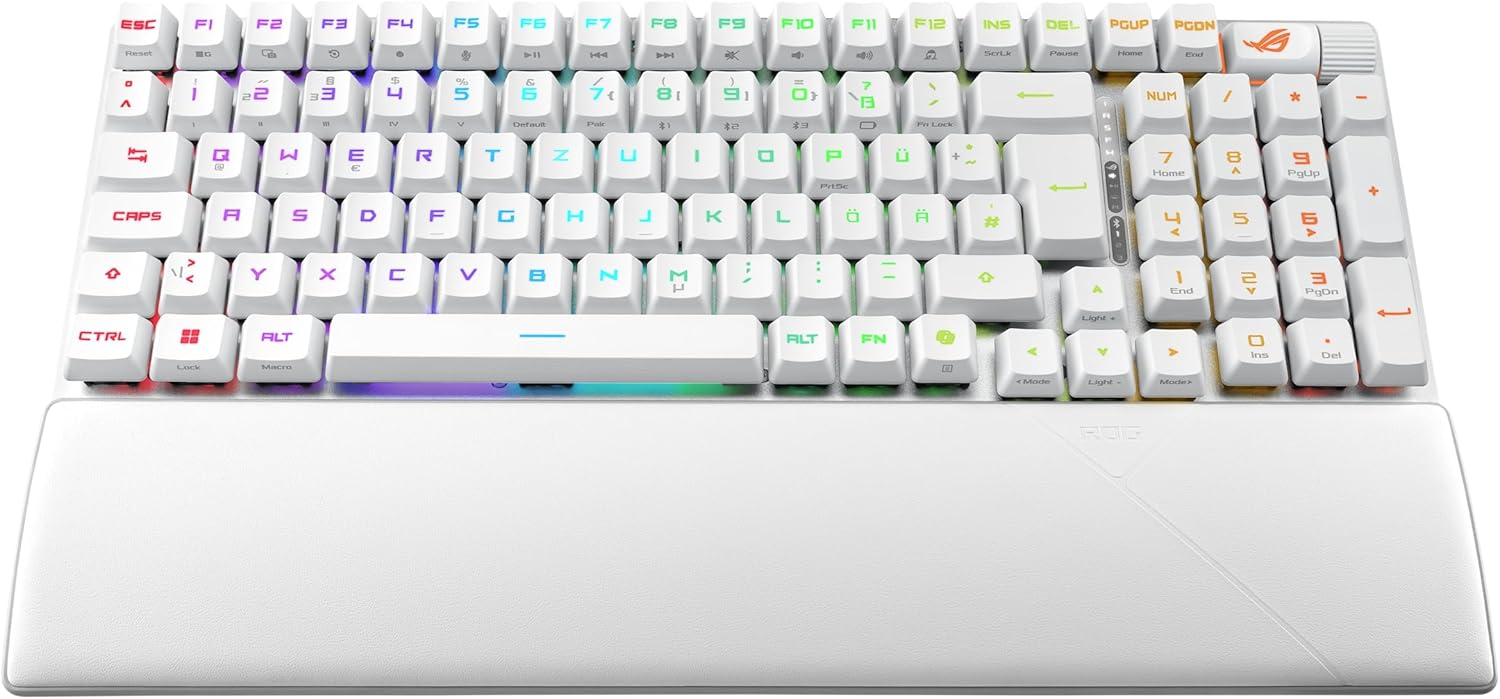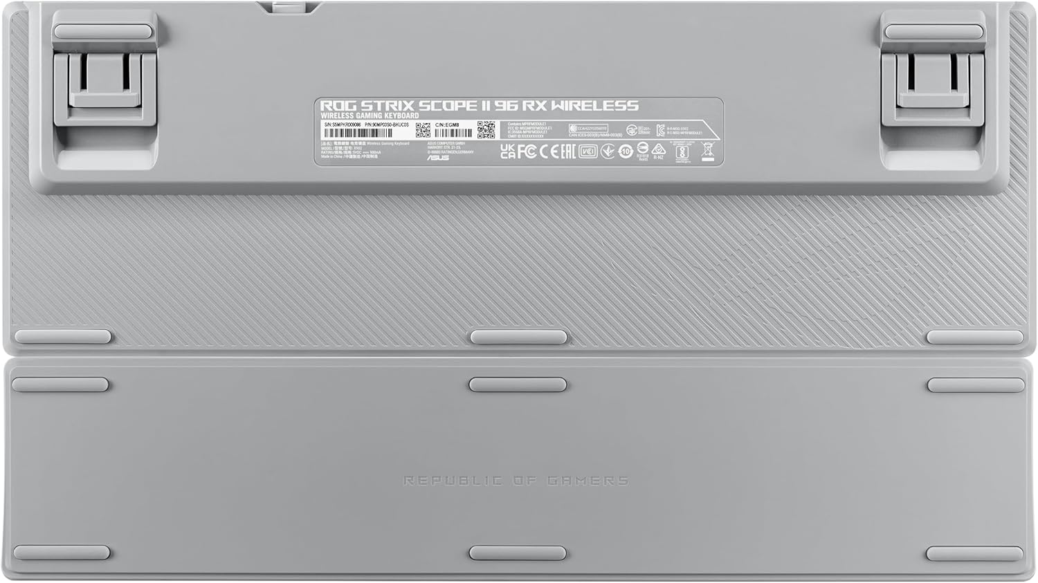 Геймърска клавиатура ASUS ROG Strix Scope II 96 RX Wireless, бяла, безжична оптична (Bluetooth, 2.4 GHz, кабелна USB, стрийминг клавиши, оптични превключватели ROG RX, стабилизатори на клавиатурата ROG, бяла)
