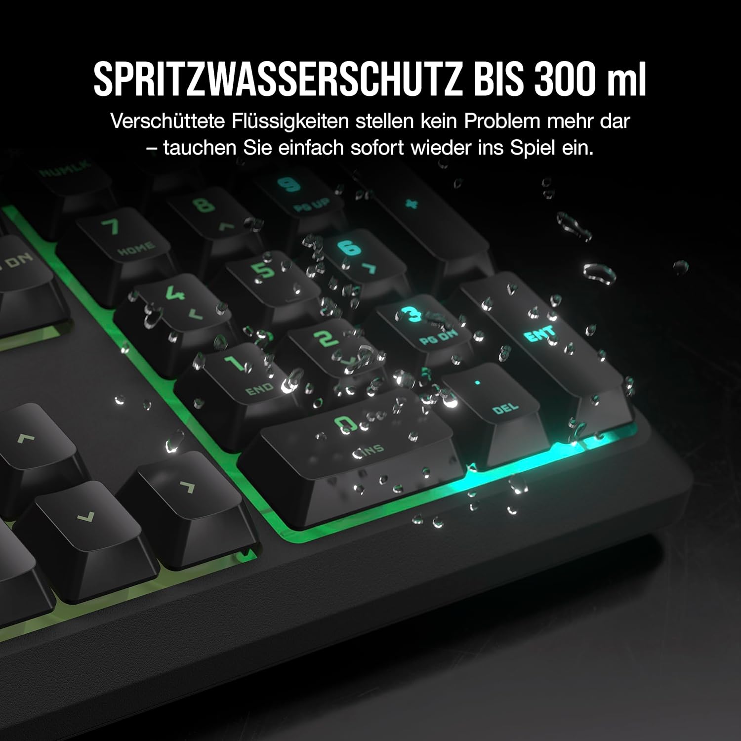 Геймърска клавиатура Corsair K55 CORE RGB с мембранно подсветка и кабел – тихи, бързо реагиращи превключватели – устойчива на разливане – десетзонова RGB – медийни клавиши – съвместима с iCUE – QWERTZ DE – PC, Mac – черна