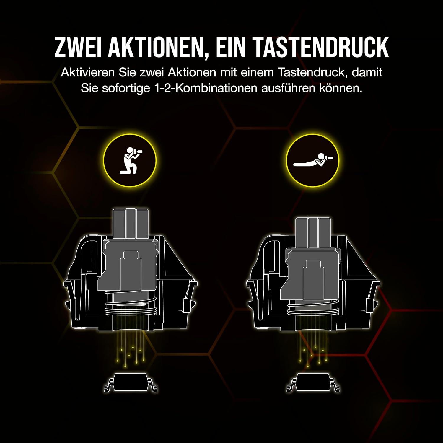 • Магнитни превключватели MGX Hyperdrive*: Предварително смазаните магнитни превключватели CORSAIR MGX Hyperdrive осигуряват плавно и изключително бързо натискане. Здравата конструкция с двойна релса намалява трептенето и гарантира пикова производителност за 150 милиона натискания - значително повече от други магнитни превключватели. * Функционалните клавиши и неосновните клавиши са оборудвани с превключватели CORSAIR MLX.
