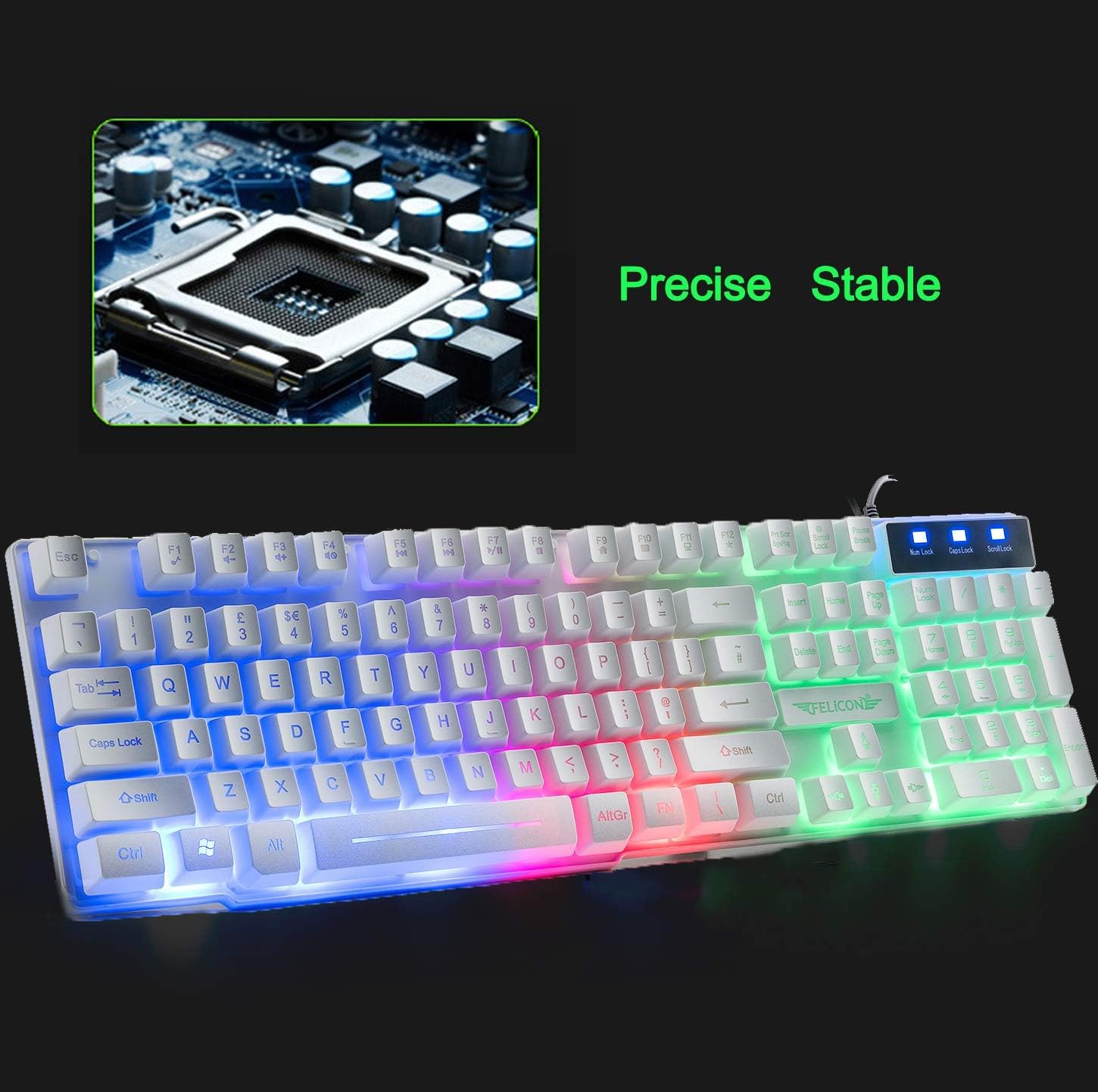 • 【Специално проектирана за игри】Геймърска клавиатура с британско оформление, модерен и съвременен ярък черен дизайн е идеална за всяко работно място. Клавиатурата разполага и с 3-цветна подсветка за употреба през нощта. Тази клавиатура е снабдена с някои клавиши за маркиране и мултимедийни клавиши, които могат лесно да се използват от напреднали потребители.