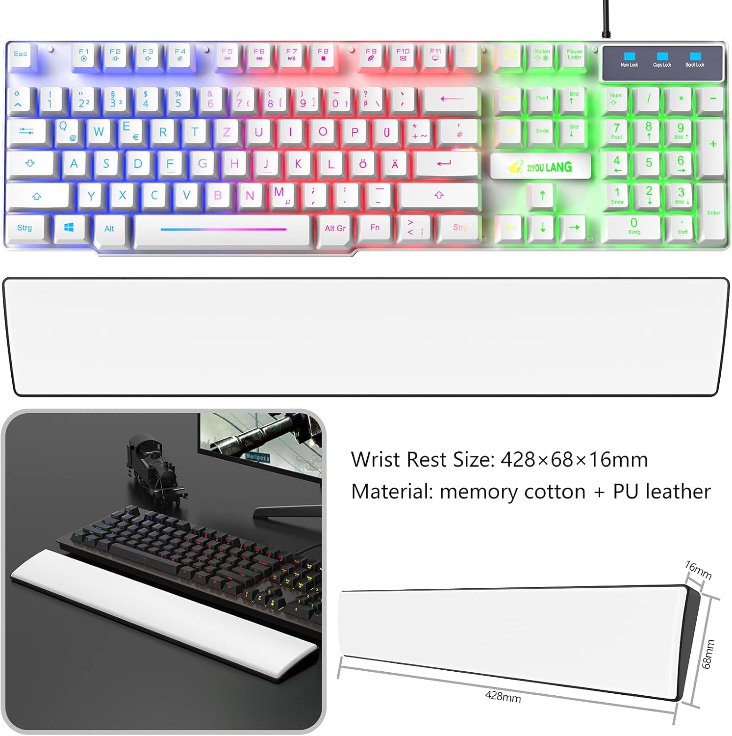 Геймърска клавиатура и мишка с поставка за китката, QWERTZ немска подредба с дъгова LED подсветка, ергономична клавиатура, 6 клавиша, 2400 DPI мишка и подложка за мишка за Windows Mac PS4, бяла