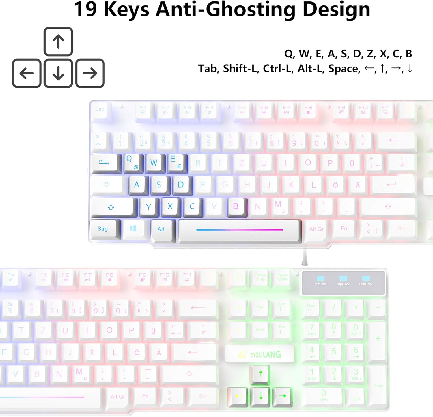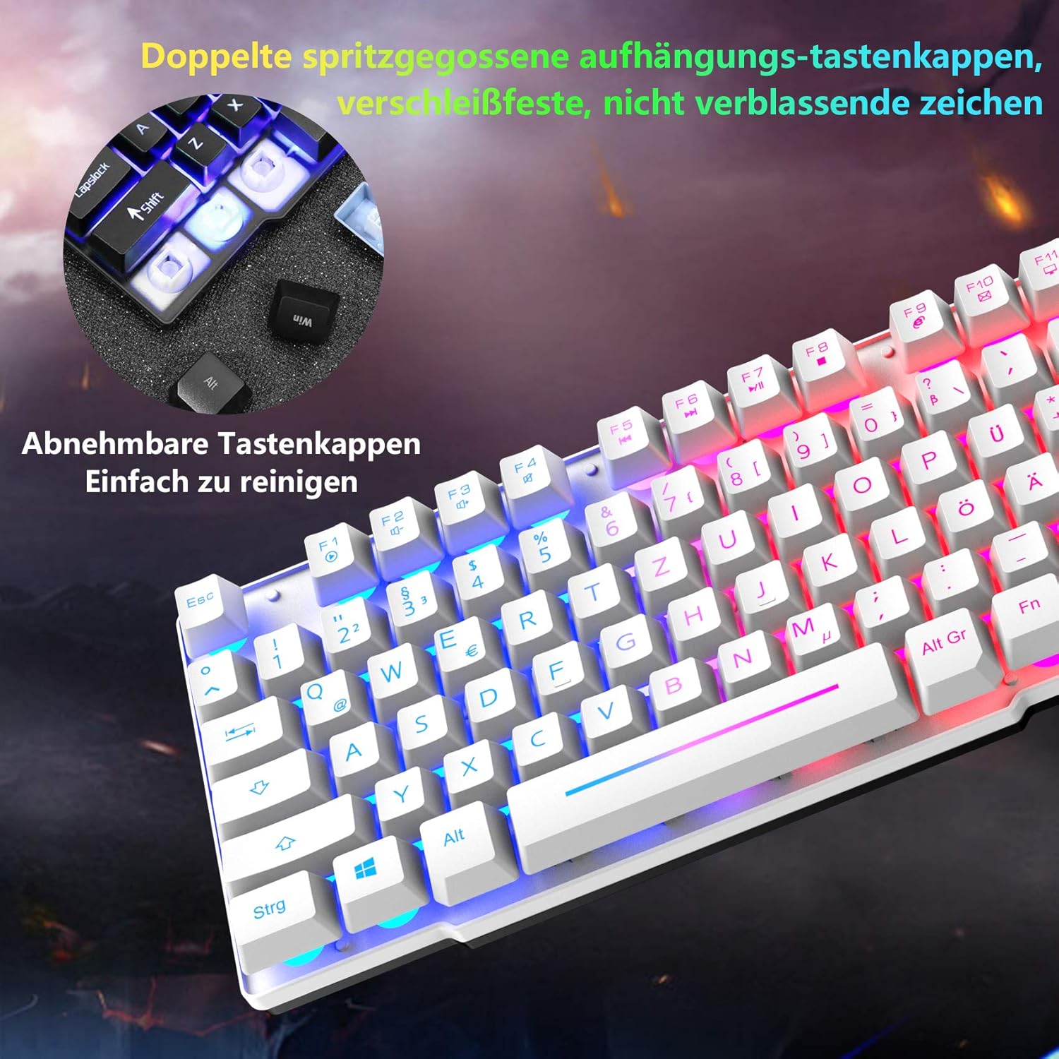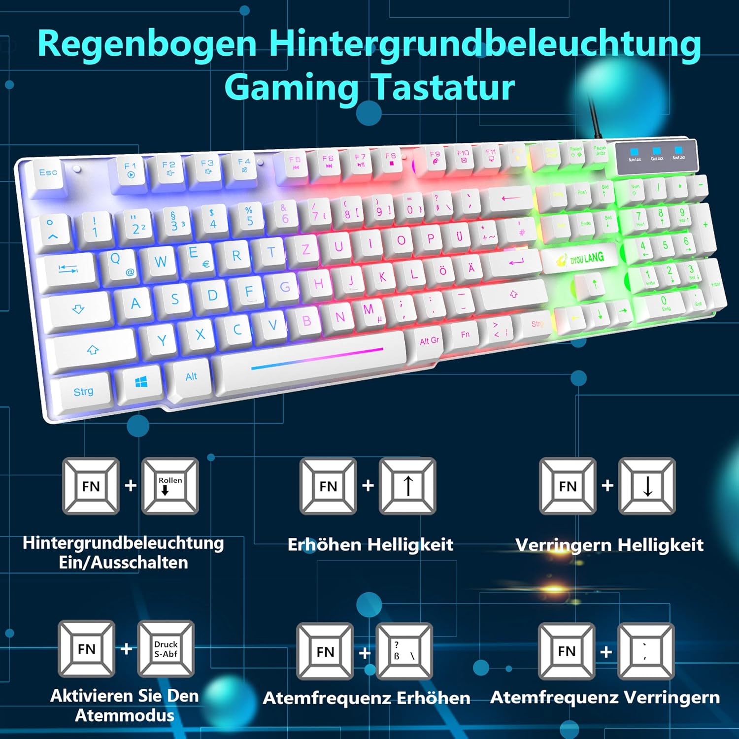 • Геймърска клавиатура с немска подредба: геймърската клавиатура с дъгова LED подсветка ви предлага цветно изживяване при писане и нощна игрова атмосфера. FN + ролки = превключвател за включване/изключване на подсветката, FN + ↑/↓ = увеличаване/намаляване на яркостта, FN + натиск S-Abf = активиране на режим на дишане, FN + ?/、 = увеличаване/намаляване на честотата на дишане. Немска подредба, 104 клавиша, 19 клавиша без конфликти, 12 мултимедийни клавиша, 50 милиона натискания. USB кабел: 1,5 м