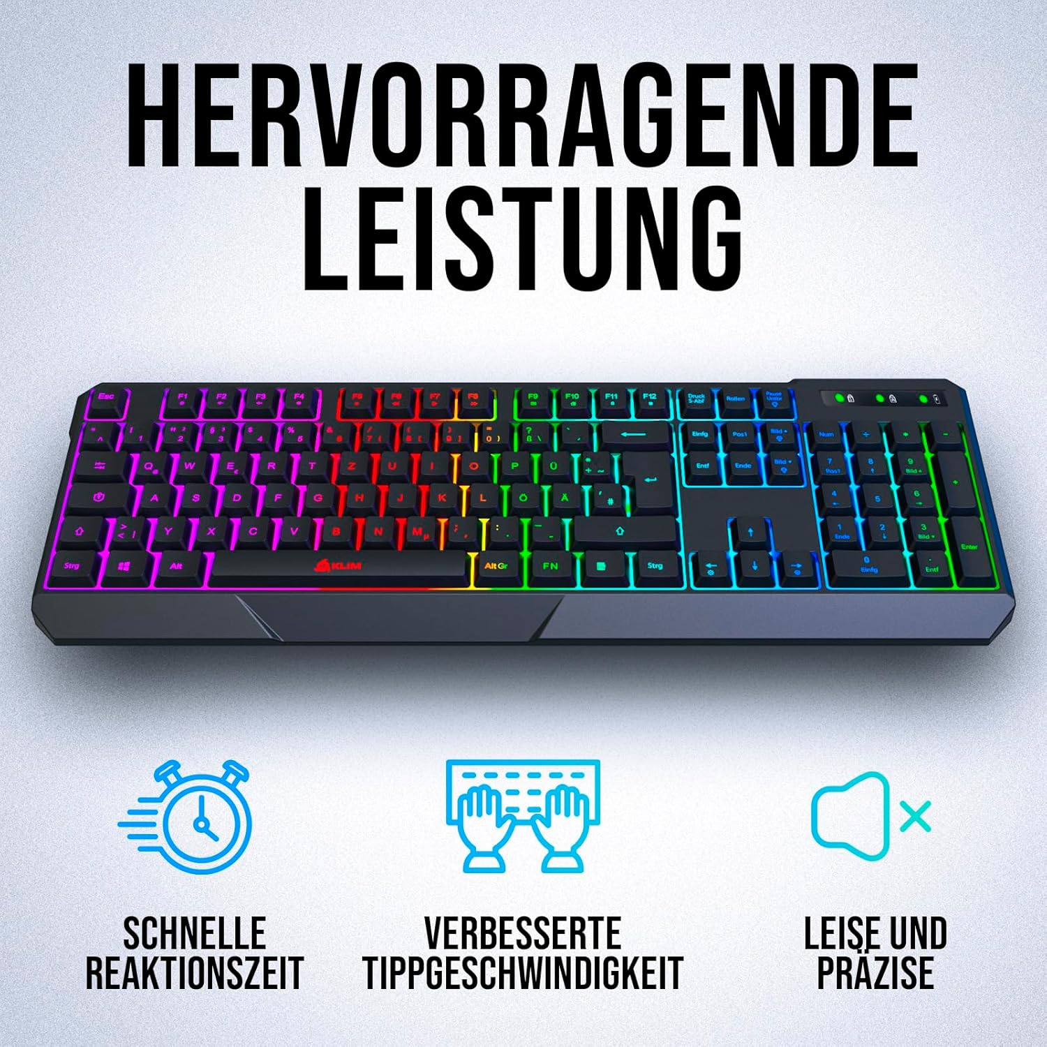 Diese kabellose Tastatur ist mit mehrfarbigen Hintergrundbeleuchtungsbereichen ausgestattet (3 Muster verfügbar). Du kannst die Helligkeit und die Geschwindigkeit der Effekte nach deinen Vorlieben einstellen. Die KLIM Blaze hat ein elegantes Design, das zu deinem anderen Gaming-Equipment passt, egal ob RGB oder nicht. Mit dem Treiber kannst du die DPI, die Polling-Rate und die Farben einstellen, um die beste Leistung zu erzielen.Wichtiger Hinweis zur Batterielebensdauer: Die RGB-Beleuchtung hat eine große Wirkung und entleert den Akku schneller, je heller sie ist. Wenn dir der Akku wichtiger ist als die Ästhetik, empfehlen wir dir, die Helligkeit zu verringern oder die Beleuchtung ganz auszuschalten.