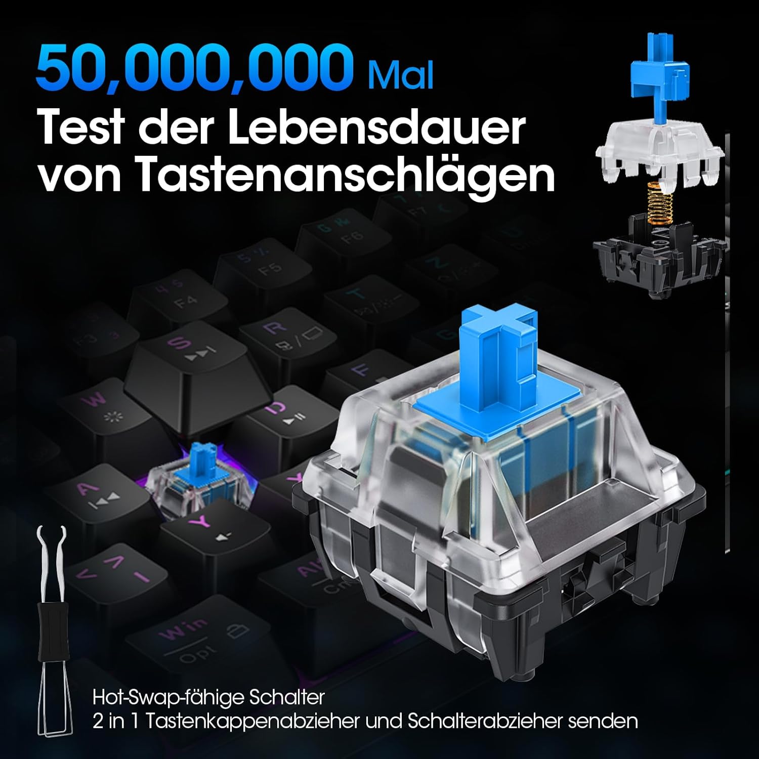 Геймърска клавиатура KOORUI, 60% механична клавиатура, 26 RGB подсветка, кабелна, немска подредба, QWERTZ, геймърска клавиатура за Windows, MacOS, Linux, син превключвател