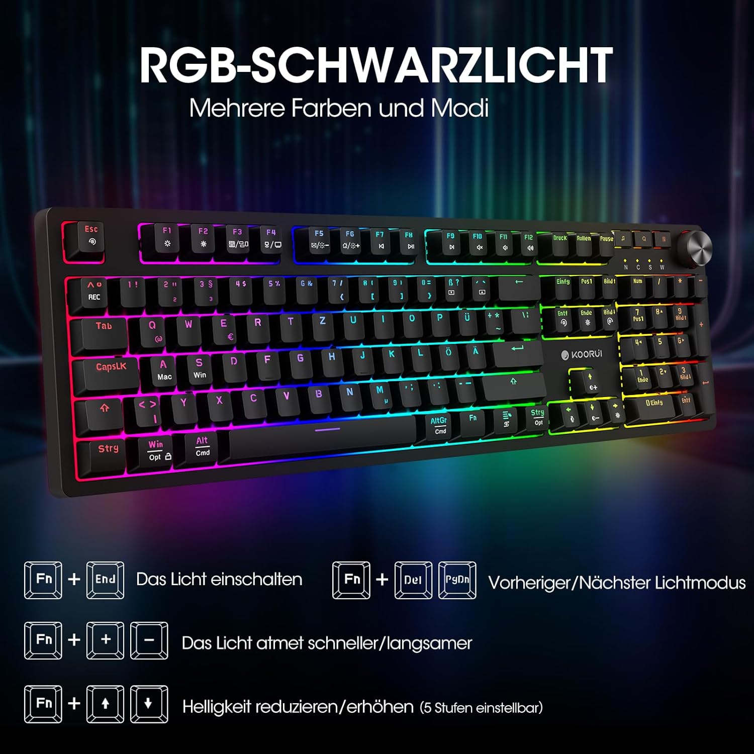 Геймърска клавиатура KOORUI, Механична клавиатура QWERTZ Немска подредба 104 клавиша 26 RGB Подсветка с кабелна клавиатура за Windows MacOS Linux Син превключвател