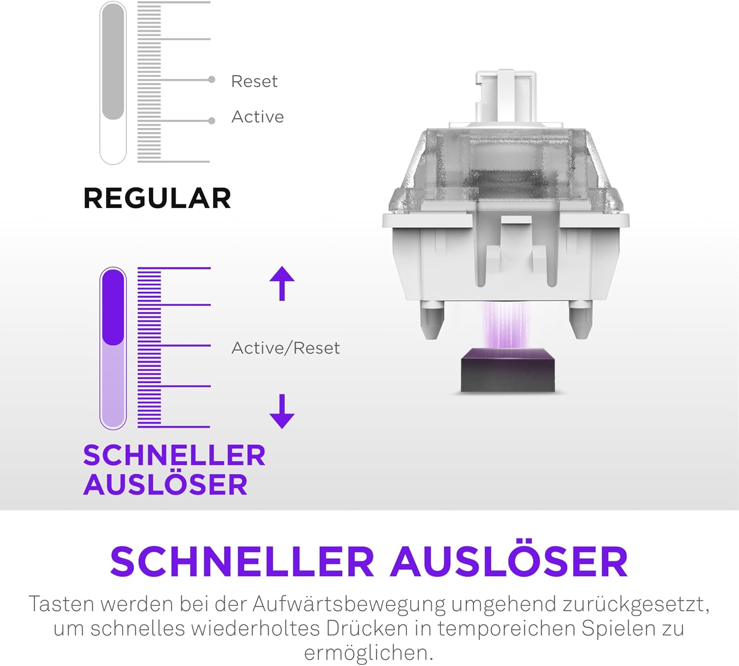 • ПОДОБРЕНА ИГРА – Rapid Trigger мигновено нулира клавишите, докато се движат нагоре, което позволява ултрабързи повтарящи се натискания, докато Snap Overrides за безпроблемно контраатакуване приоритизира последното ви натискане между A и D.