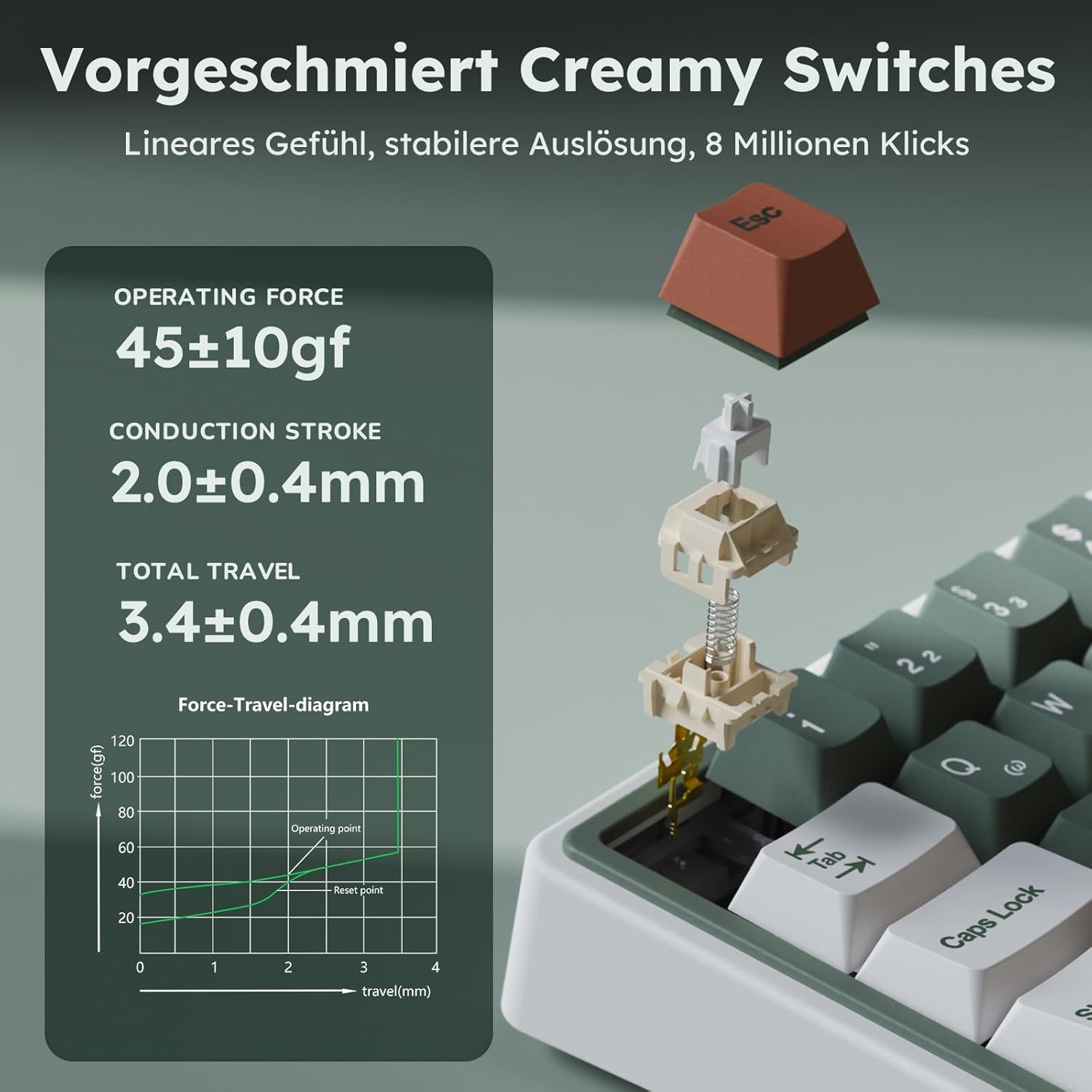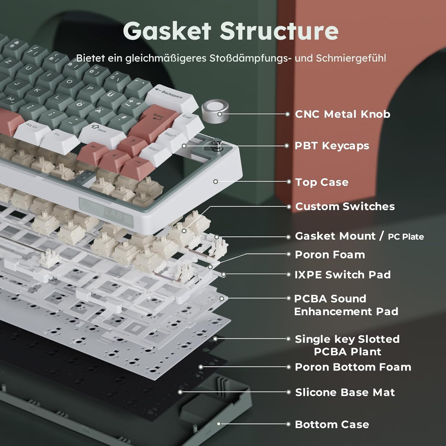 • Уплътнителна структура и слот за един клавиш на печатна платка: Механичната клавиатура QWERTZ има иновативна уплътнителна структура и слот за един клавиш, за да оптимизира устойчивостта и стабилността. Комбинацията от 5 слоя звукопоглъщащи материали, включително Poron памук, IXPE възглавница под дръжката, филм за подплънки под дръжката, памук под дръжката, силикон и др., намалява шума, прави бутоните ясни и осигурява Hi-Fi слушателско изживяване.