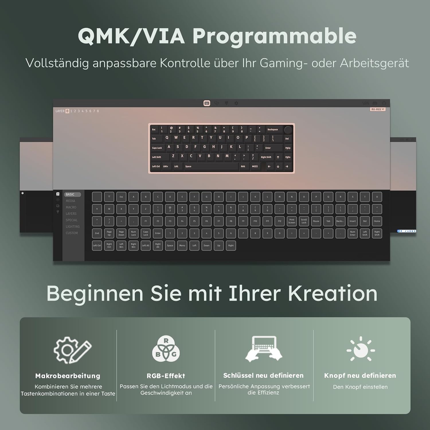 • RGB и QMK/VIA: RGB клавиатурата има повече от 20 вградени предварително зададени настройки за подсветка. Можете да избирате RGB ефекти и монохромни ефекти, да изключвате подсветката, яркостта, скоростта и др. с прости операции с бутони. Също така има 16 милиона RGB цвята на осветление, които са регулируеми. Персонализираната клавиатура поддържа QMK/VIA програмируемост. Това е система с отворен код, специално проектирана за клавиатури. В сравнение с традиционния софтуер, можете да създавате макро команди, преназначавания, ефекти на подсветката и др. по-бързо.