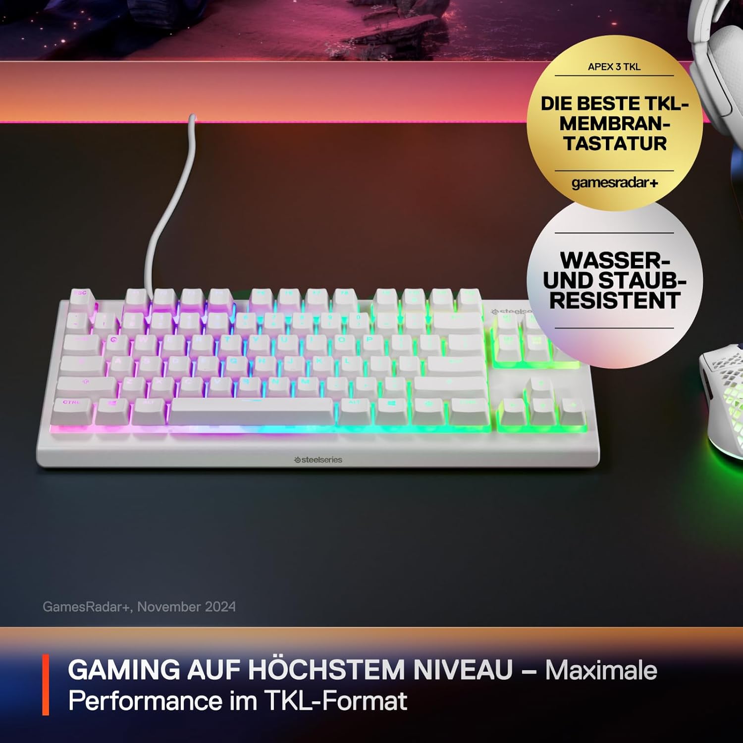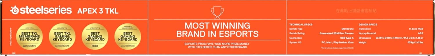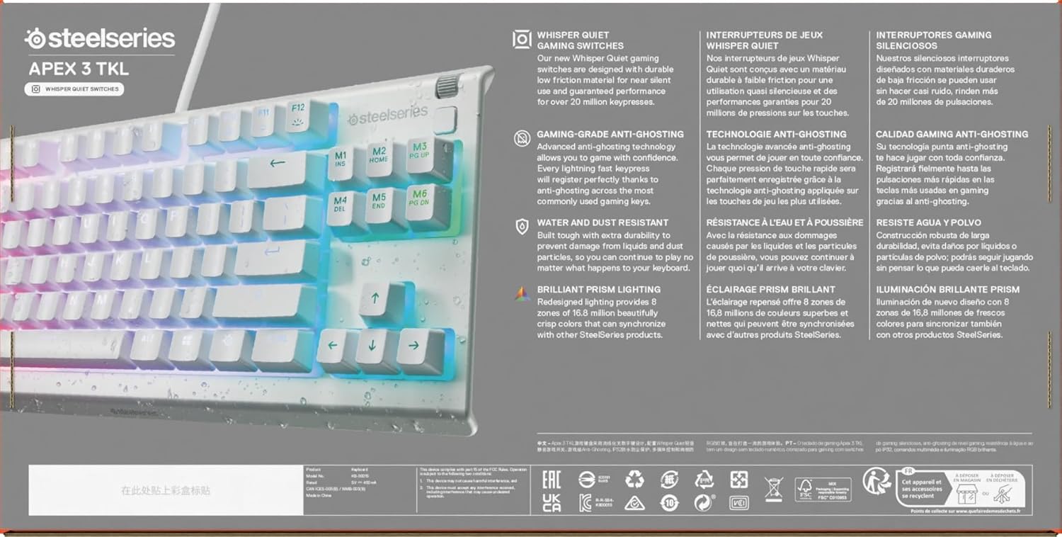 Геймърска клавиатура SteelSeries Apex 3 TKL White RGB - Компактен форм-фактор без клавиши - 8-зонно RGB осветление - Устойчивост на вода и прах - Изключително тихи геймърски превключватели - NOR оформление QWERTY