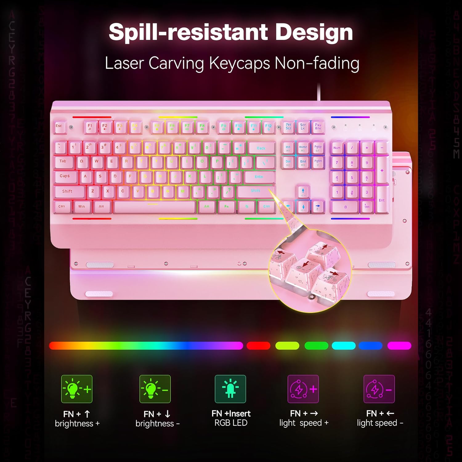 Геймърска клавиатура TECKNET RGB Pink за компютър, мембранна клавиатура със 105 клавиша, изцяло метален панел за китката, 15-зонно RGB осветление, 25 клавиша против ghosting, компютърна клавиатура