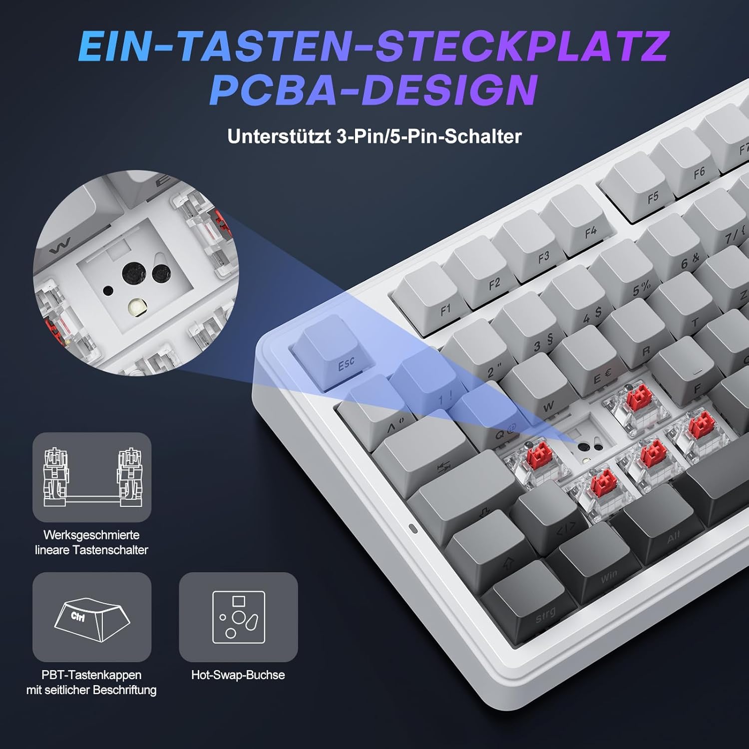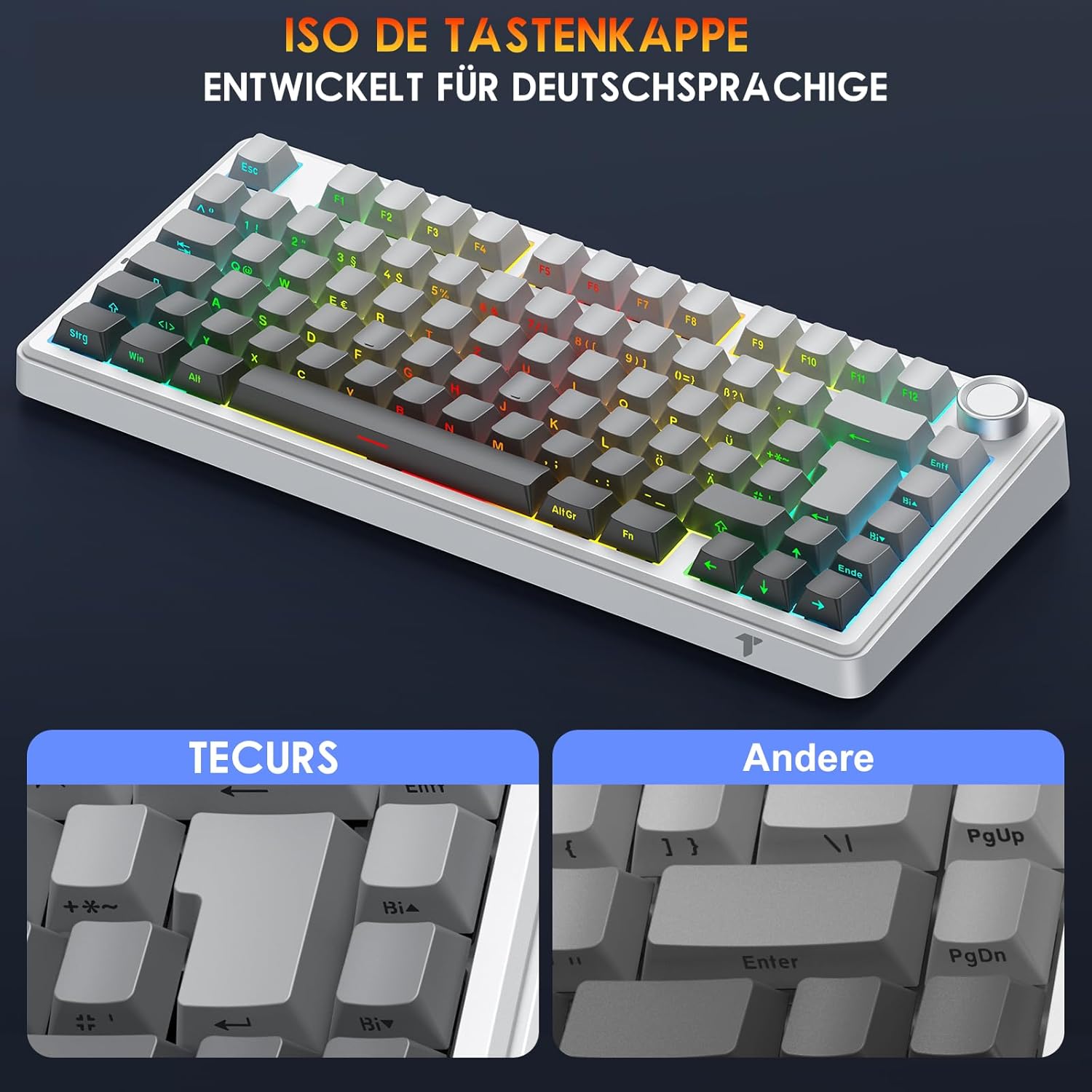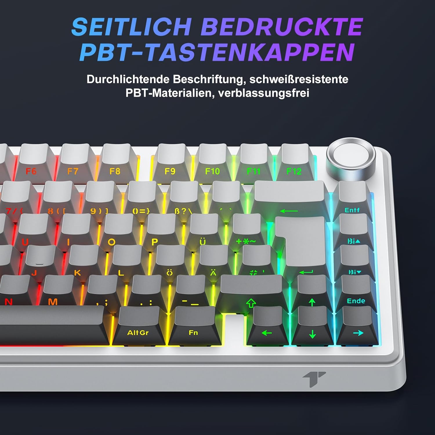 Геймърска клавиатура TECURS, механична, ISO DE, с 75% Hot-Swap, безжична, с червено уплътнение на ос, PBT, RGB, кремава, MK209 (2.4G/BT/Type C), QWERTZ - за геймърска конфигурация