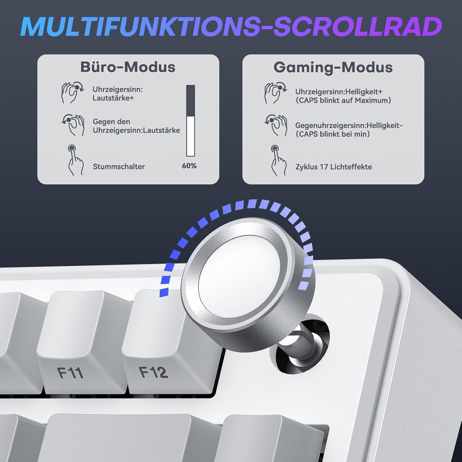 • PBT КАПАЧКИ ​​ЗА БУТОНИ, МНОГОФУНКЦИОНАЛЕН ОБЪРТ: Изработени за издръжливост и първокласно усещане. Капачките на клавишите, изработени от издръжлив PBT материал, са устойчиви на износване и блясък. Прецизно изработеният бутон позволява интуитивен контрол на силата на звука и RGB осветлението за непрекъснат работен процес.