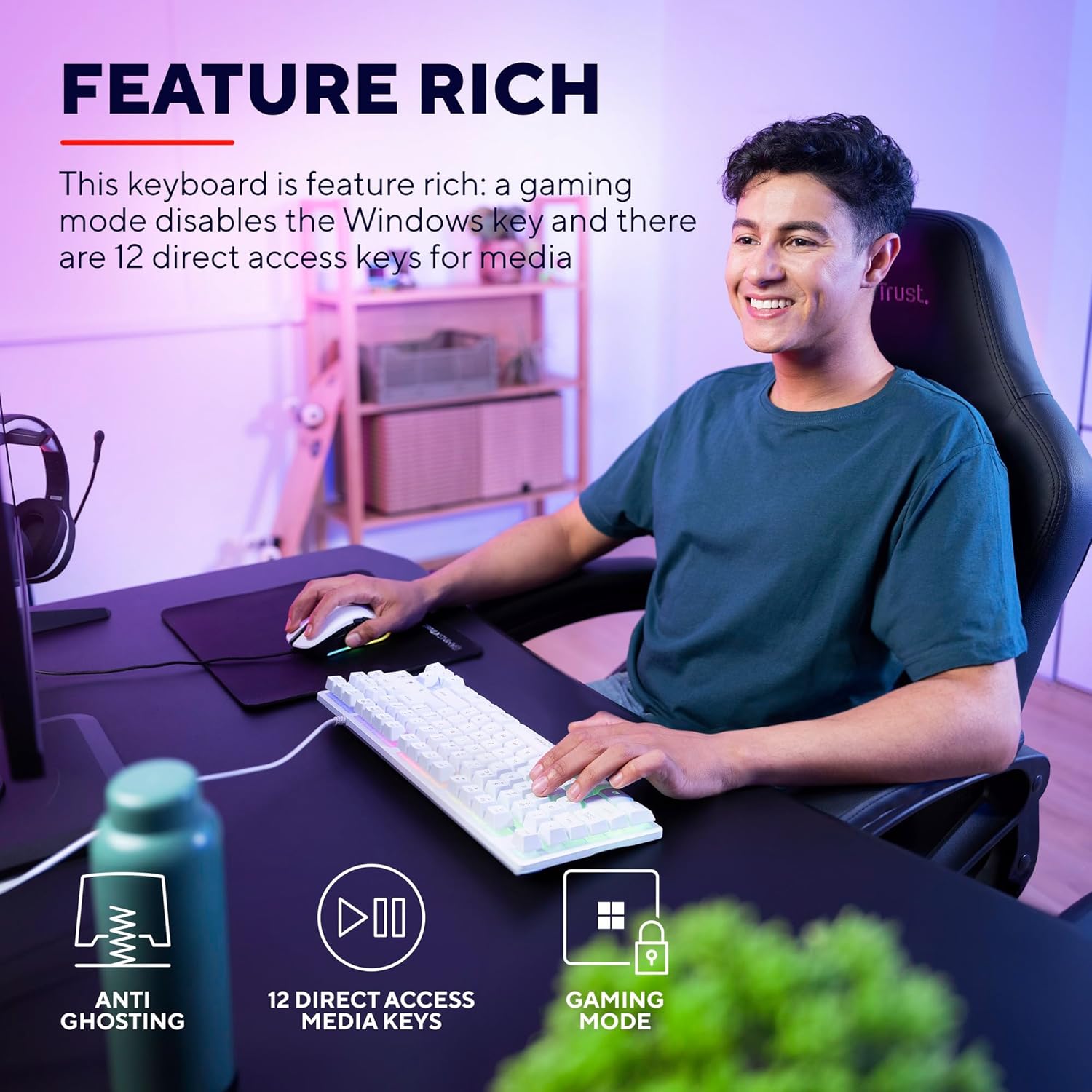 Геймърска клавиатура Trust Gaming GXT 833W Thado TKL с немски QWERTZ код, компактна 80% USB, изработена от метал, Anti-Ghosting, LED осветление, рециклирани материали, за PC, лаптоп, Mac - бяла