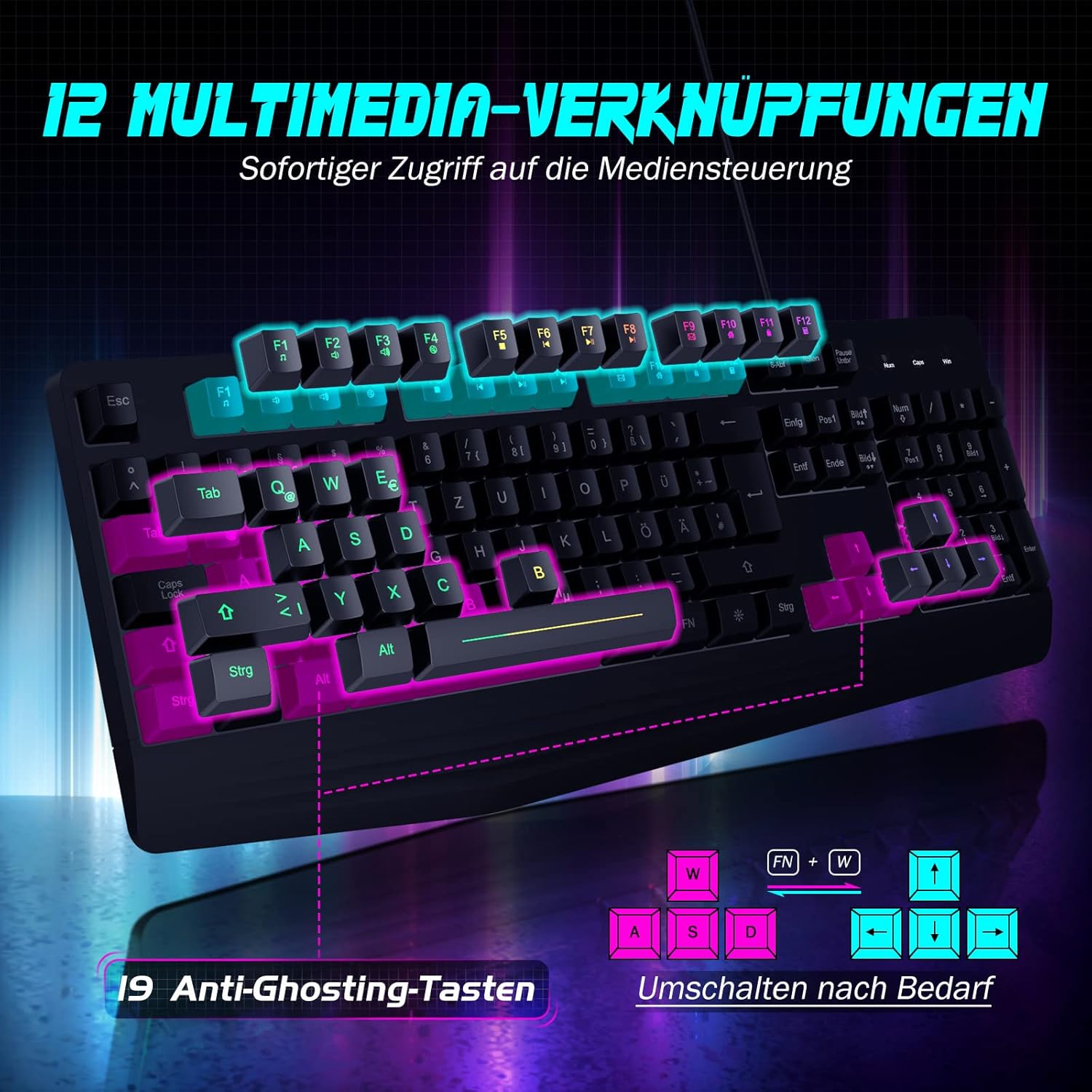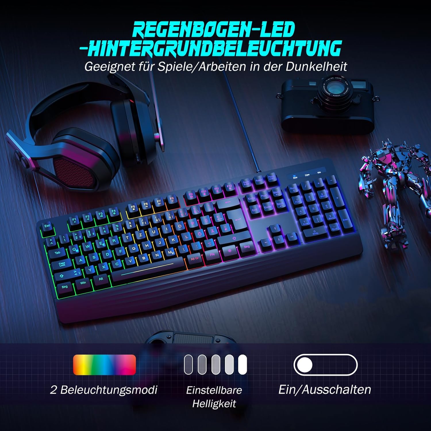 Геймърска клавиатура за PC, PS4 клавиатура с USB, клавиатура с дъгова подсветка с LED, издръжлива, ергономична, водоустойчива, тихи клавиши, геймърска клавиатура, идеална за PC, Mac, Xbox, PS4, геймъри, офис (немска подредба)