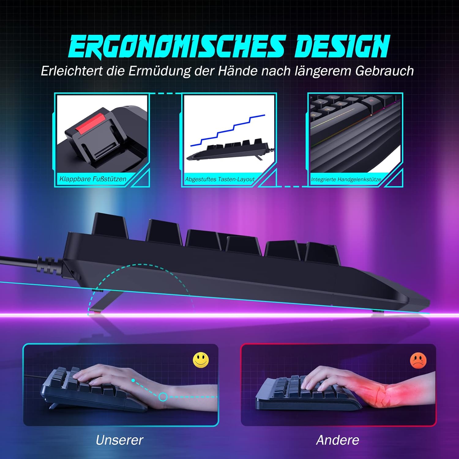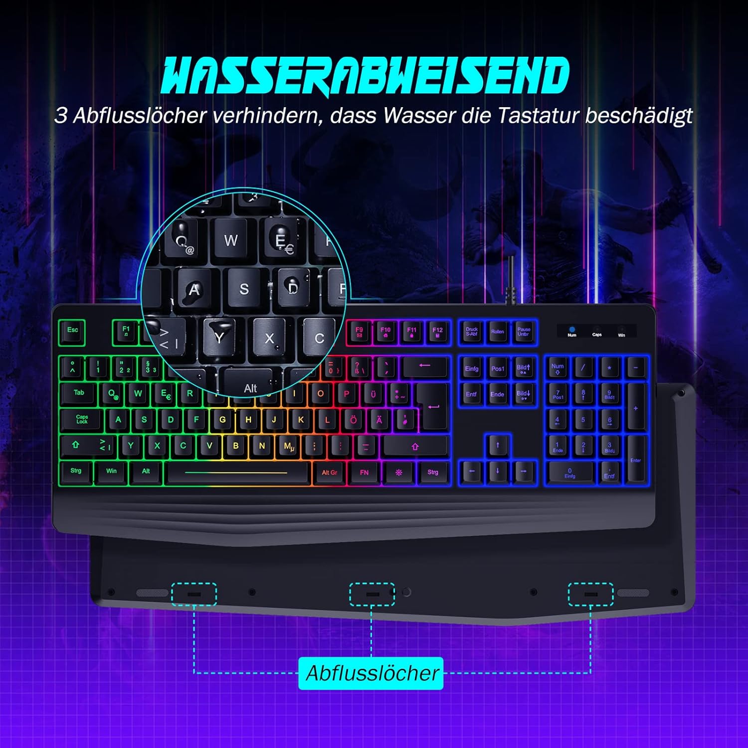 Геймърска клавиатура за PC, PS4 клавиатура с USB, клавиатура с дъгова подсветка с LED, издръжлива, ергономична, водоустойчива, тихи клавиши, геймърска клавиатура, идеална за PC, Mac, Xbox, PS4, геймъри, офис (немска подредба)