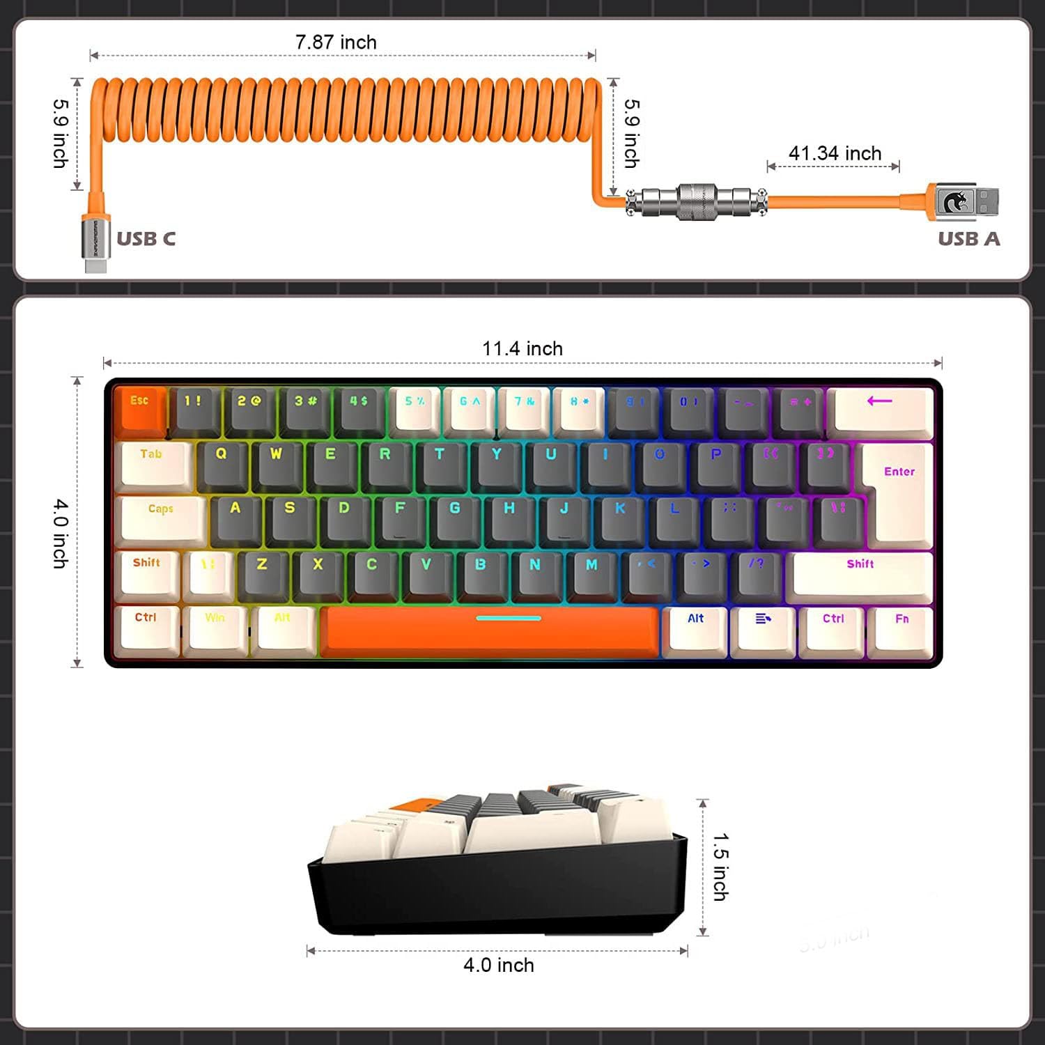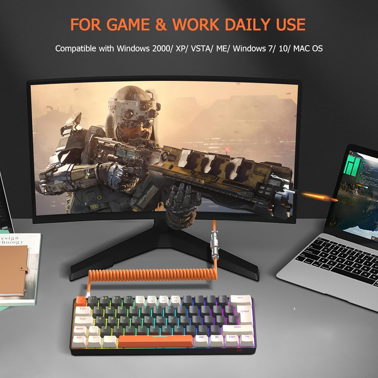 • Спирален USB C кабел за геймърска клавиатура: Този комплект клавиатура и мишка за игри има кабел за клавиатура с тонално навита клавиатура. USB C кабел за механична геймърска клавиатура с двоен ръкав и подвижен метален авиационен конектор, с nano TPU, предназначен за професионални геймъри и ефективна работа. Кабелът Type-C към USB-A поддържа безопасно и бързо зареждане и скорост на синхронизиране на данни.