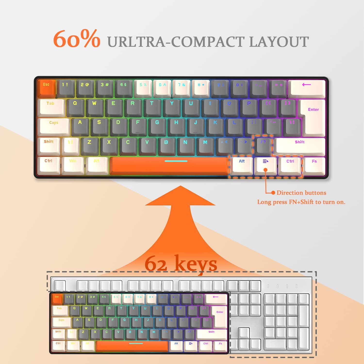 Геймърска клавиатура ZIYOU LANG T60 с кабел и спирален USB-C кабел - компактна механична клавиатура с 60% британско разположение (QWERTY), 19 дъгови RGB подсветени мини клавиша с 62 щракащи сини превключватели за PC/Mac - Glimmer