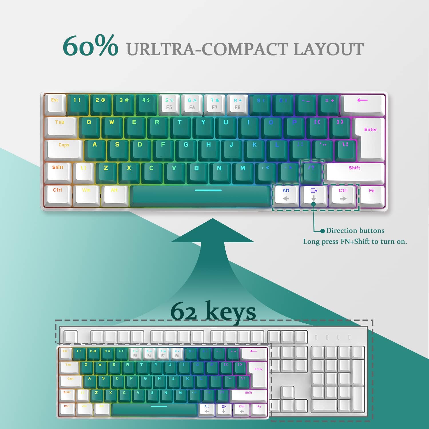 Геймърска клавиатура ZIYOU LANG T60 с кабел и спирален USB-C кабел - компактна механична клавиатура с 60% британско разположение (QWERTY), 19 дъгови RGB подсветка, мини 62 клавиша, син превключвател за PC/Mac/PS4 - зелена