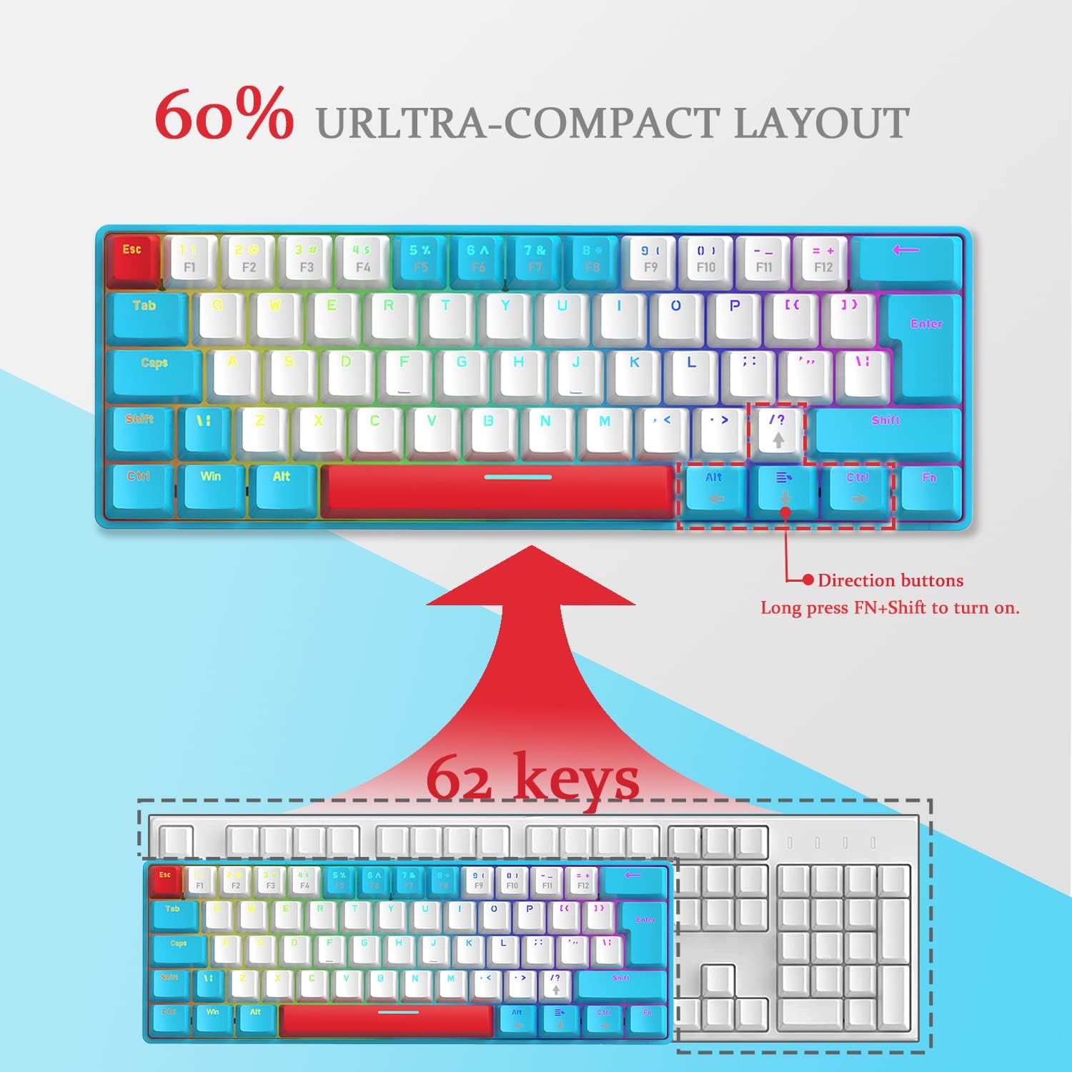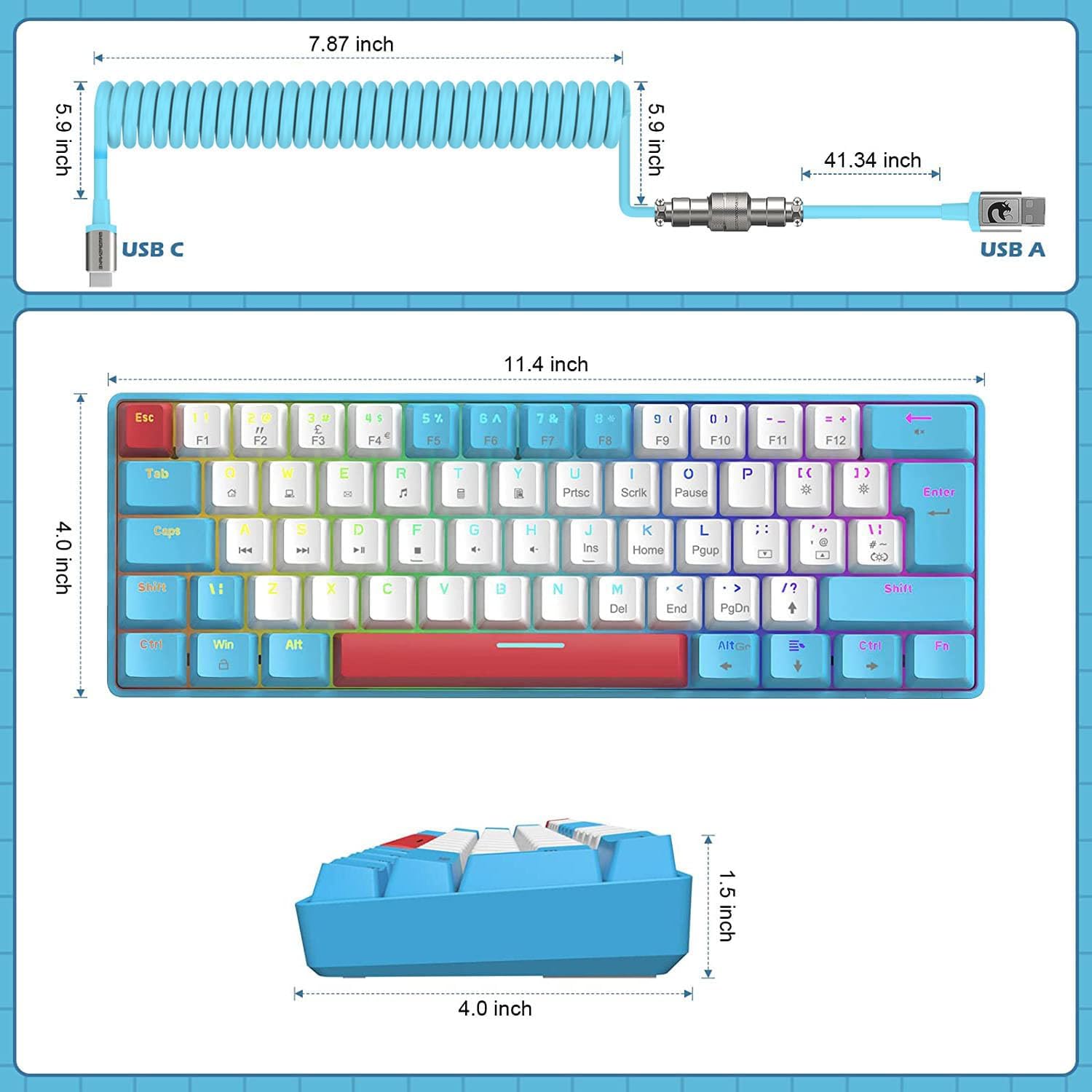 Геймърска клавиатура ZIYOU LANG T60 с кабел и спирален USB-C кабел - компактна механична клавиатура с 60% UK Layout (QWERTY), 19 Rainbow RGB подсветка, мини 62 клавиша, линейни червени превключватели за PC/Mac/PS4 - Bee