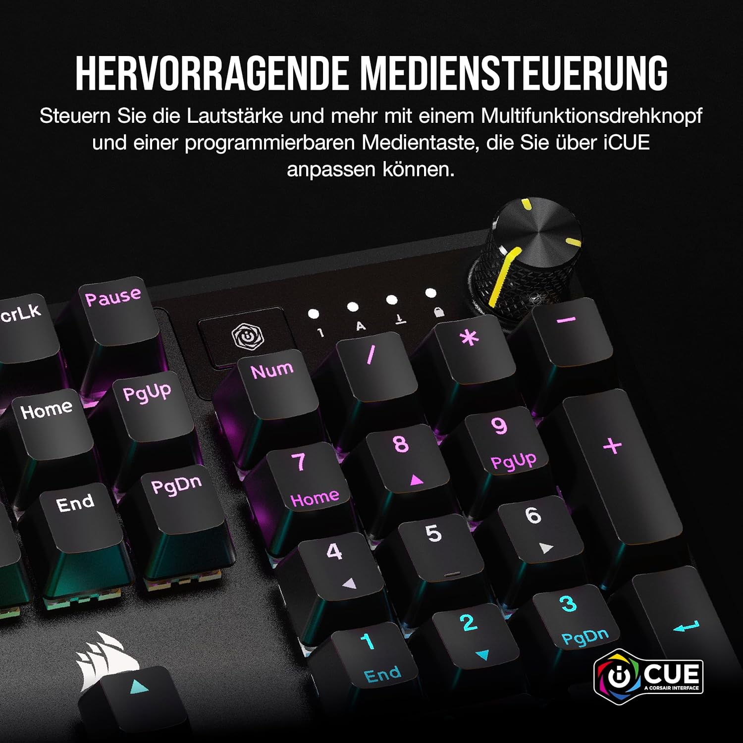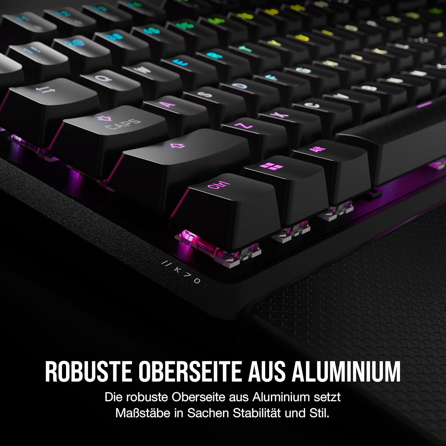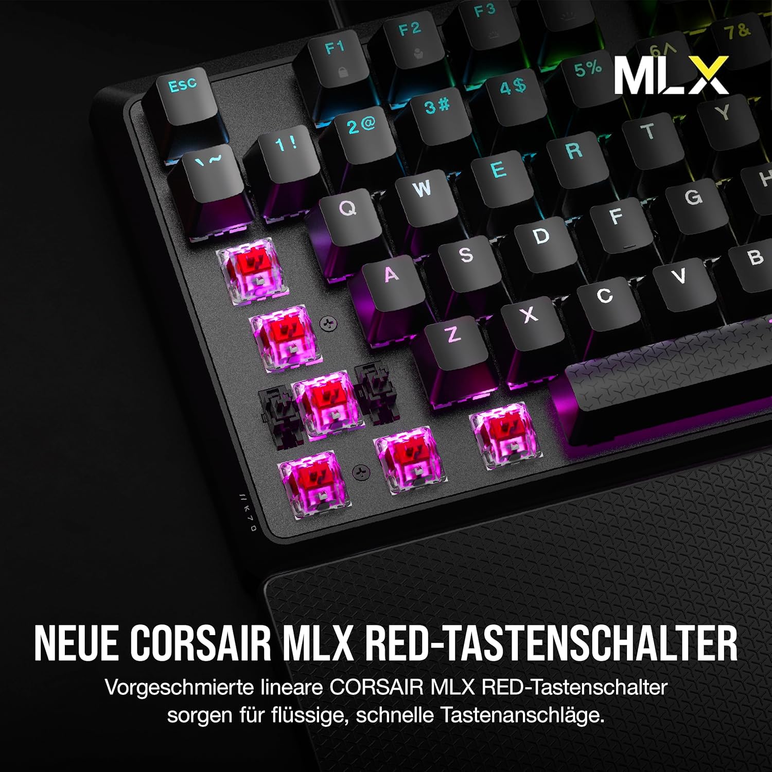 Геймърска механична клавиатура CORSAIR K70 CORE RGB с поставка за китката - смазани MLX червени линейни превключватели, SOCD, звукопоглъщане, колело за управление на медийни файлове, съвместима с iCUE, QWERTZ DE - черна