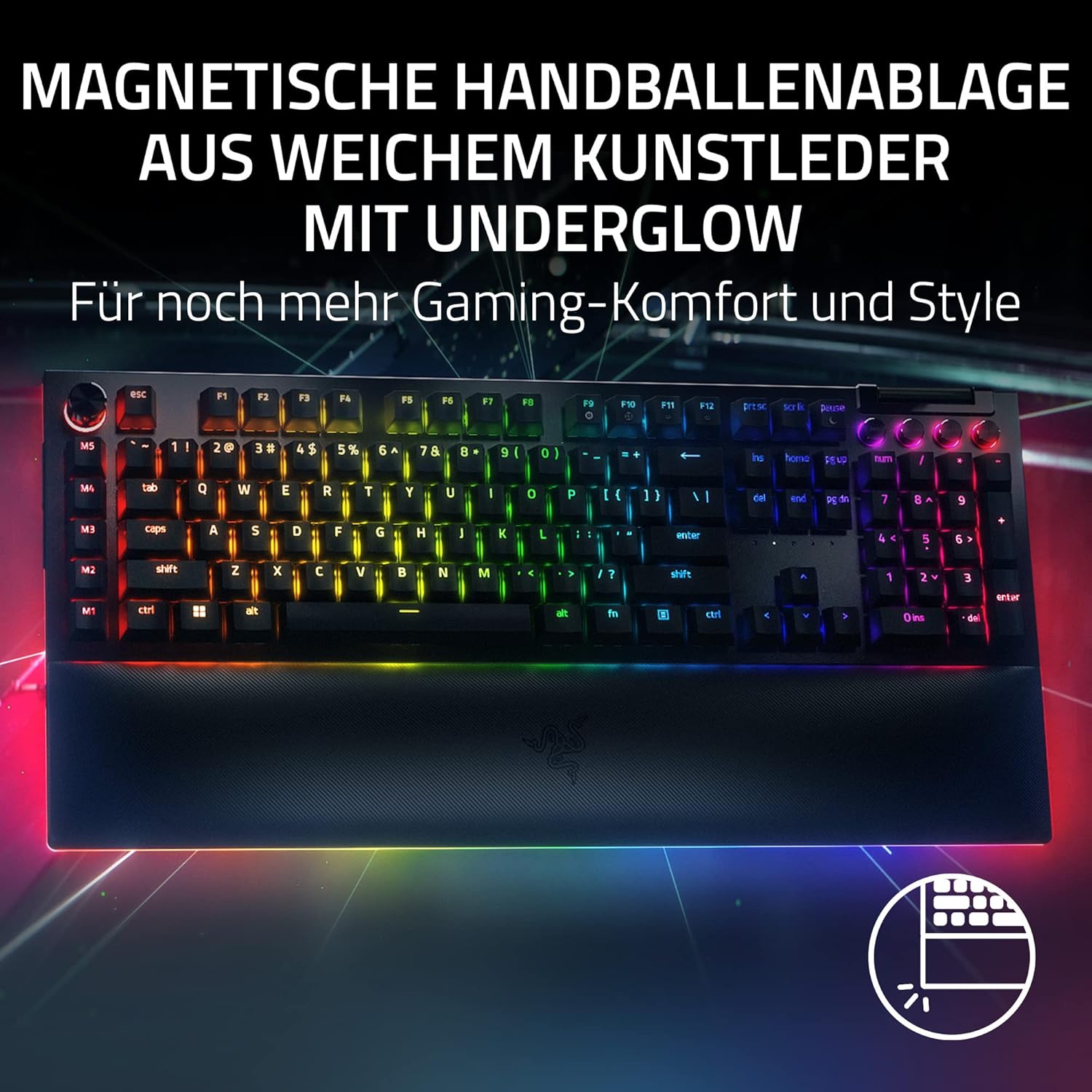Геймърска механична клавиатура Razer BlackWidow V4 Pro Chroma RGB (зелени механични превключватели, командно колело и 8 макро клавиша, многофункционална роля) с немска подредба, черна