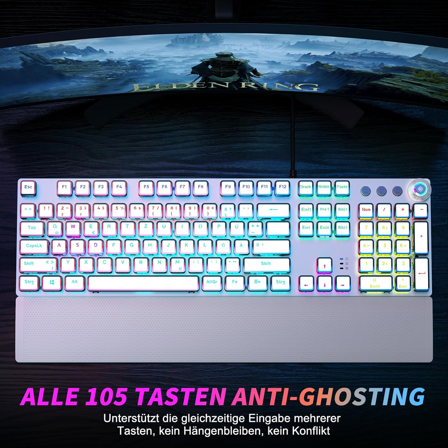 Геймърска механична клавиатура TECURS - програмируема с магнитна поставка за китката, червен превключвател, 19 LED режима, мултимедийни клавиши, компютър с кабел, QWERTZ DE оформление, бяла