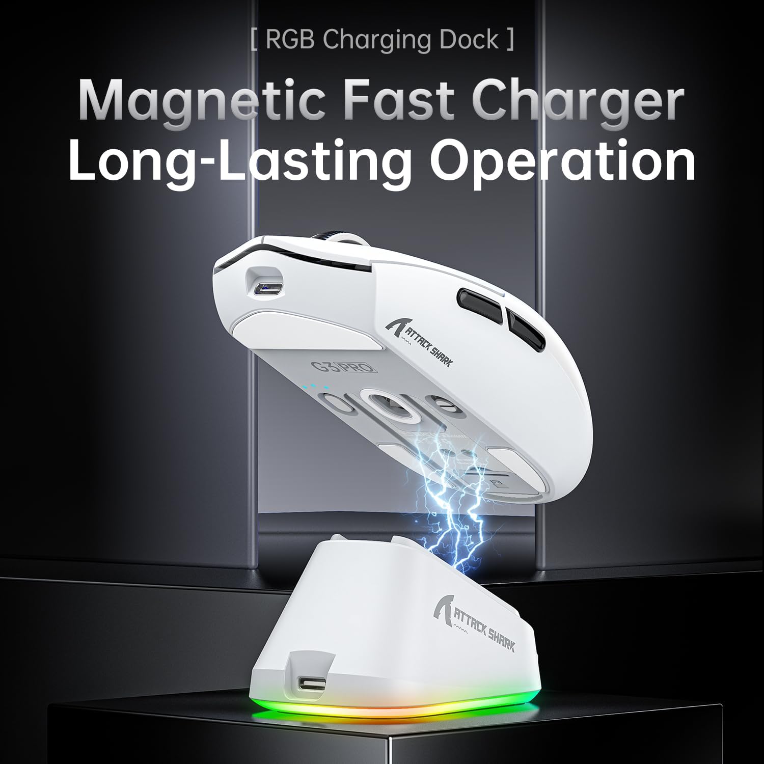 • Станция за зареждане: магнитен дизайн за бързо и удобно зареждане. Просто поставете мишката G3PRO върху станцията - винаги напълно заредена и готова за следващото ви приключение. С чувствителен на допир превключвател: докоснете, за да превключвате светлинните ефекти.