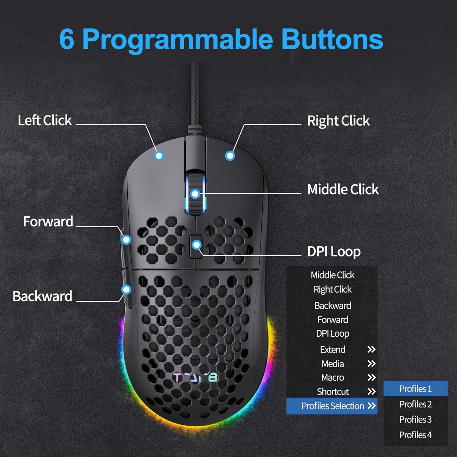 • Софтуер за драйвери: с мощния софтуер за драйвери от TMKB можете да преназначавате функциите на бутоните на мишката, да записвате макроси, да конфигурирате нива на обработка и да регулирате цвета на RGB лентите.