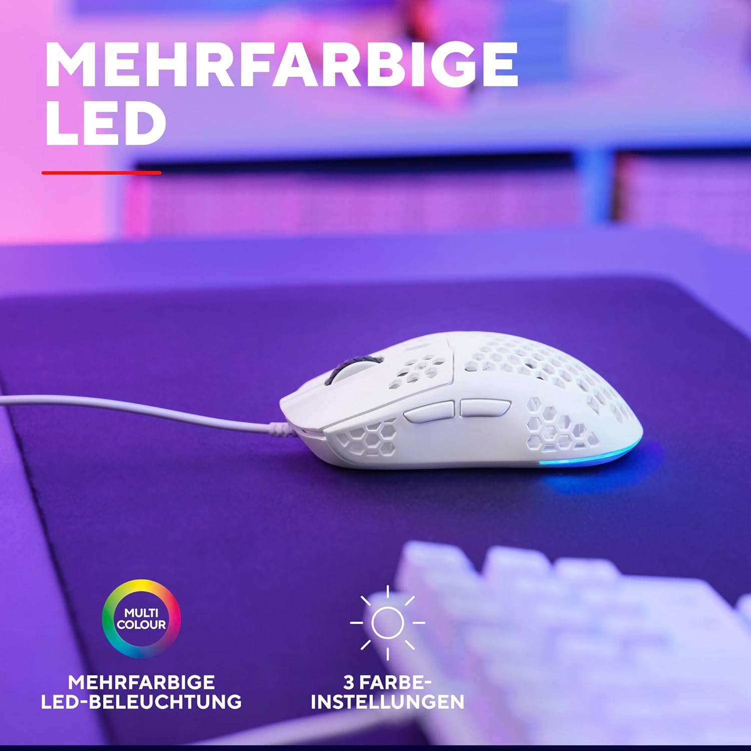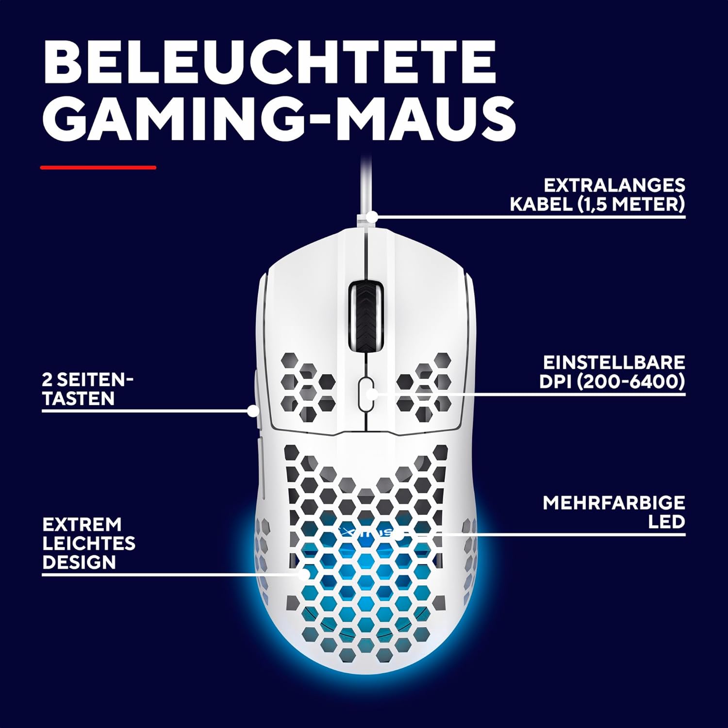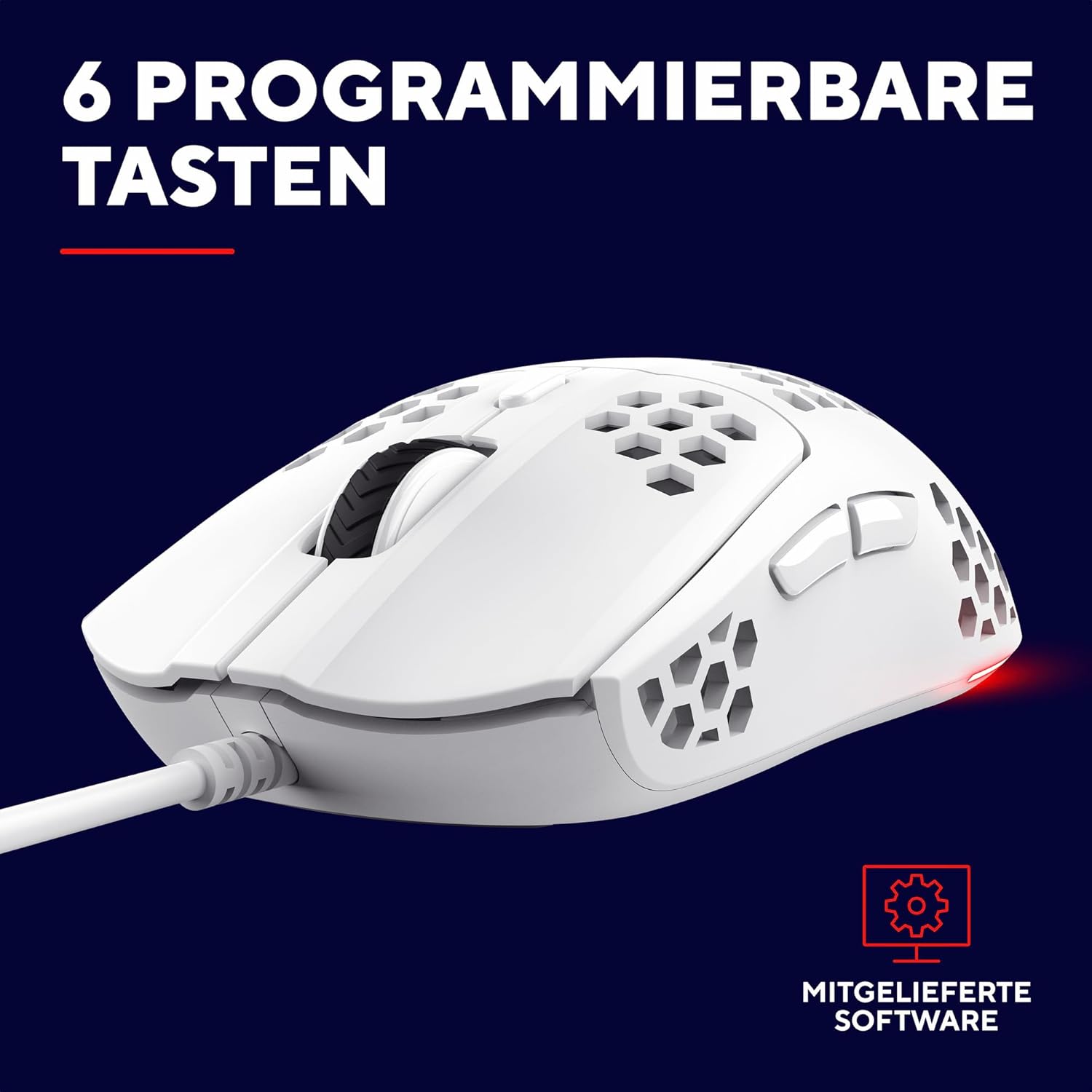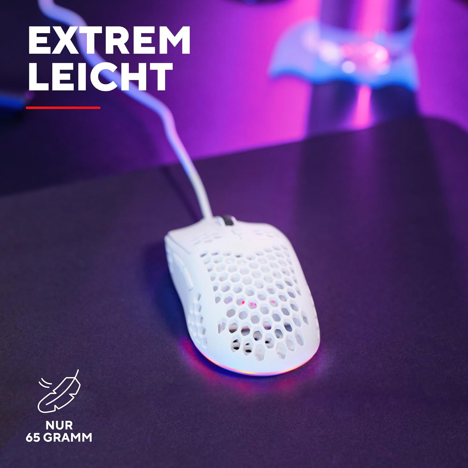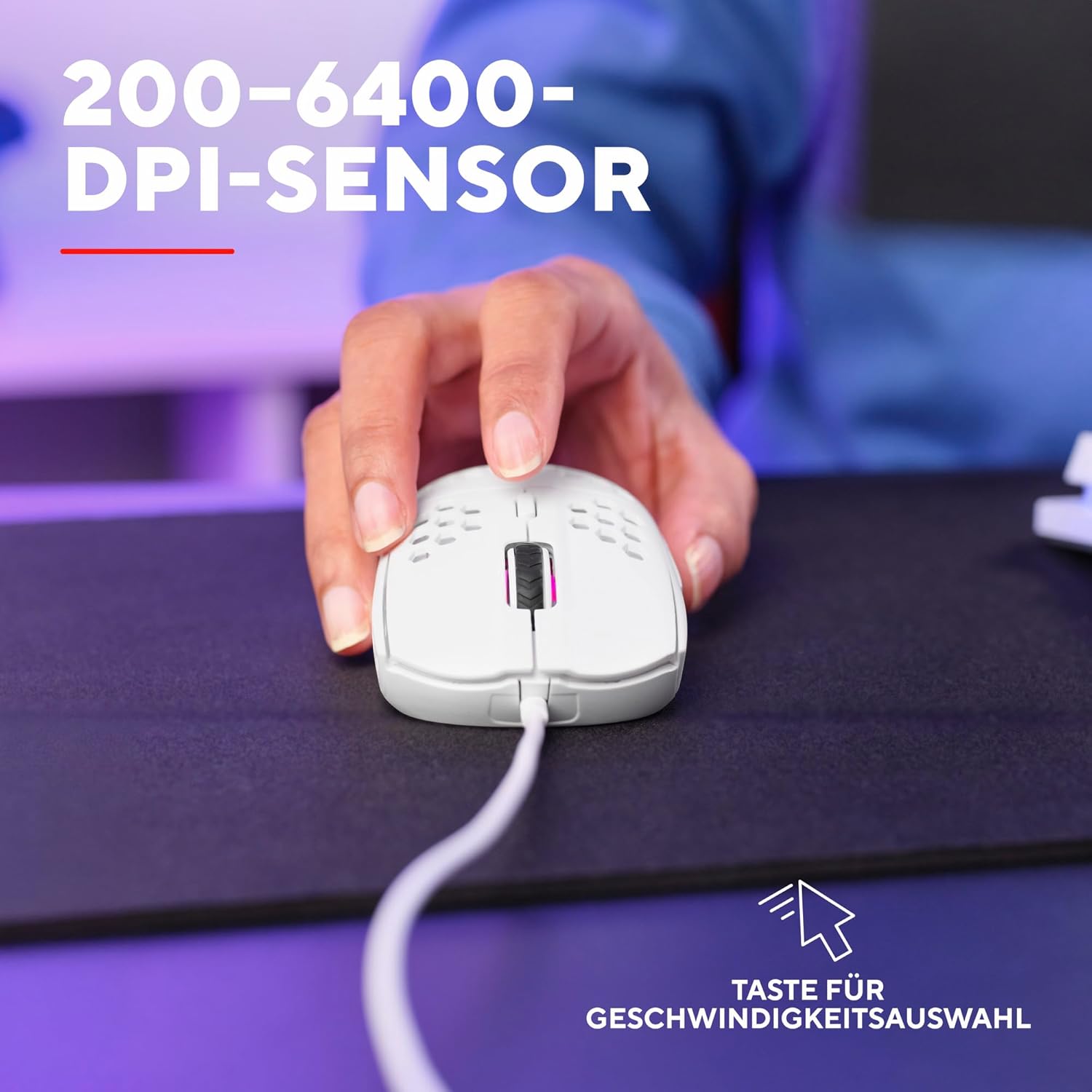 • ИЗГИБЕН ДИЗАЙН - Готин външен вид за готини игри. Структурата тип „пчелна пита“ прави корпуса на мишката особено лек и удобен, като същевременно осигурява изключително стилна настройка.