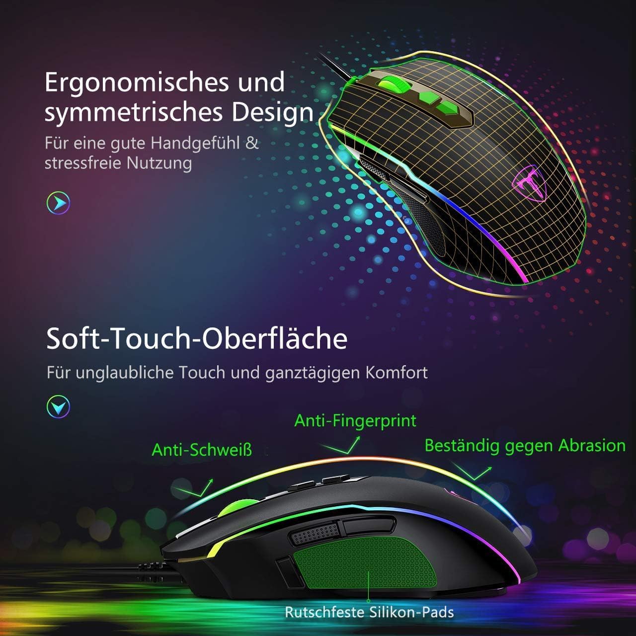 Whether programmable functions, chic, cool multiple backlight, unsurpassed ergonomic layout, strong durability or excellent performance, this wired mouse, tailor-made and specially designed for beginners and experienced players, meets your requirements for playing, a weapon you should not miss to fight for your victory. Functional and practical fire button. Equipped with a fire button on the left side, this game mouse achieves that a click on the fire button corresponds to a triple click on the left button, giving you a head start in the game. Easy operation. Supports plug and play without the need for drivers or software. The nickel-plated USB port ensures stable data transmission without interference or delays when gaming. 1.5 m long power cord provides sufficient freedom of movement. 5 adjustable CPI Simply press the CPI button to switch between different CPI levels to adjust the mouse speed to match game requirements. Each CPI has its own indicative color: 1200 (red), 2400 (blue), 3500 (green), 5500 (purple) and 7200 (yellow). Note: On a Mac system, the side buttons do not work and the programmable functions cannot be performed. Specification: Product dimensions: 12.5 x 6.7 x 4 cm / 4.92 x 2.64 x 1.57 inches. Number of buttons: 8 (programmable). Transmission mode: wired USB VPI: 1200/2400/3500/5500/7200 Tracking system: Optical Cable length: 1.5. 59,06 inch Keystroke life: 20,000,000 times (left/right buttons) / 3,000,000 times (CPI buttons) Package contents: 1 x wired gaming mouse. 1 x driver disk. 1 x user manual (English language not guaranteed)