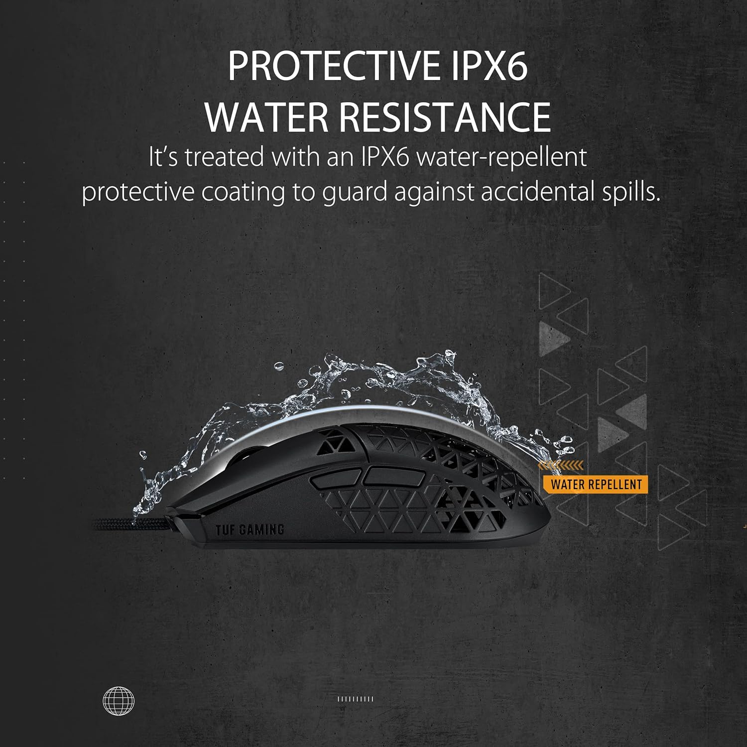 Геймърска оптична мишка ASUS TUF Gaming M4 Air (кабелна, за двете ръце и лява ръка, 16 000 DPI сензор, DPI бутон, Aura Sync, шест програмируеми бутона), черна