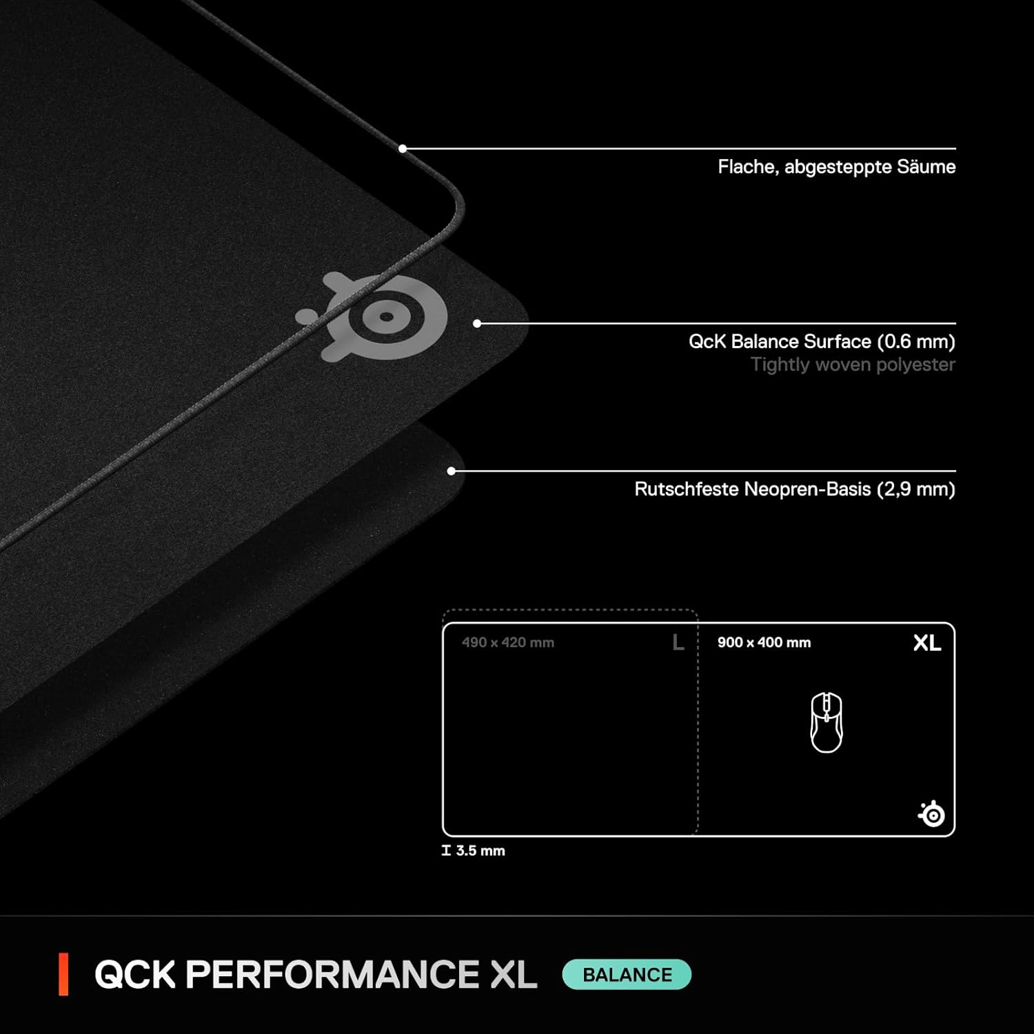 Геймърска подложка за мишка SteelSeries QcK XL Performance Balance - Допълнителна плътност за плавно плъзгане - Плоски шевове по подгъвите - Неплъзгаща се неопренова гумена основа - 900 x 400 мм - FPS, MOBA, RTS, MMO