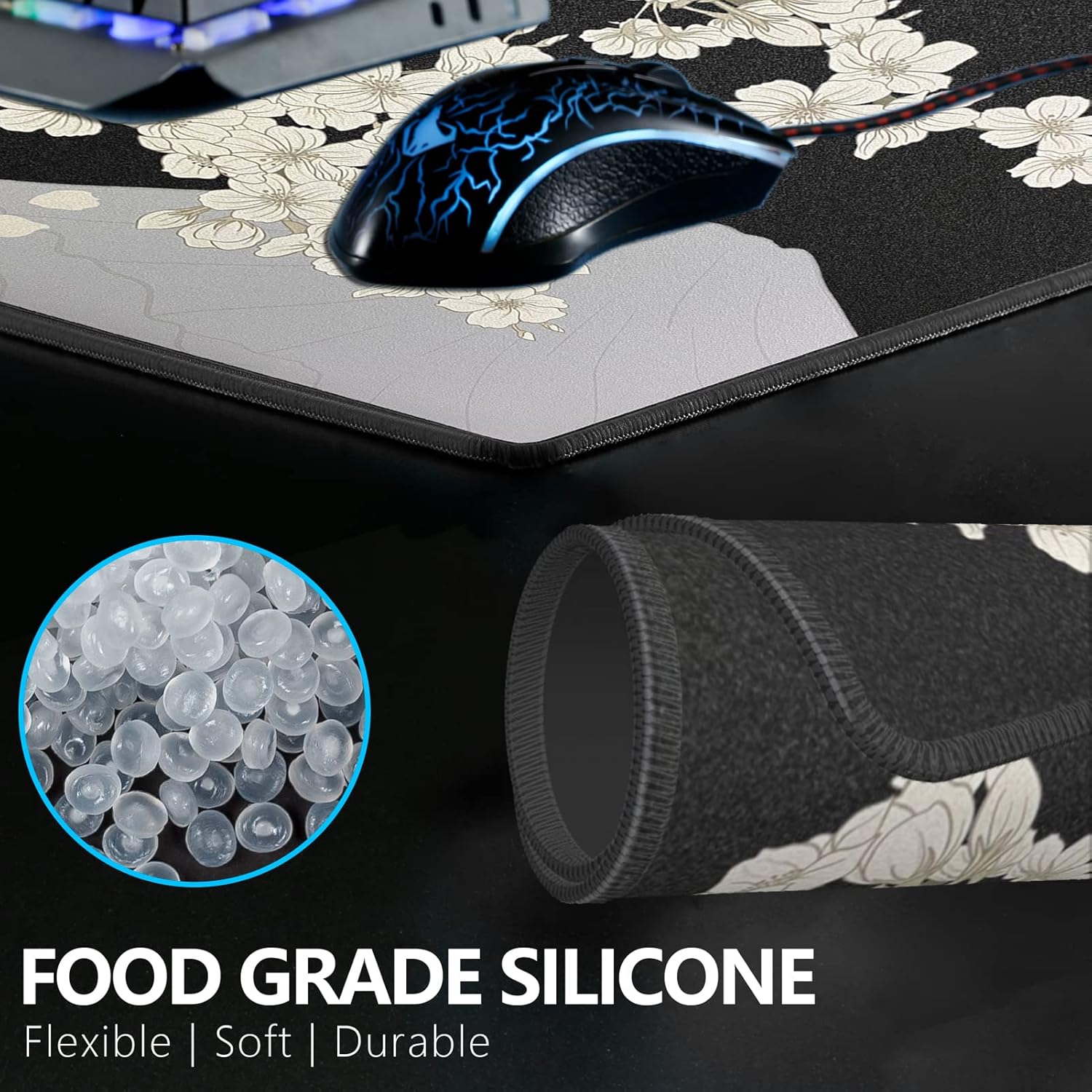 • Текстура на повърхността: посоката на плетене на тъканата текстура на предната част на гумения материал е неравномерна и управлението на мишката по оста X/Y не се влияе по време на игра, което намалява усещането за ограничено плъзгане по повърхността. Подложката е с дизайн, устойчив на пот, а повърхността на мишката не влияе на плъзгането на мишката по време на игра, когато е мокра или изпотена, което е подходящо за играчи с потни ръце.