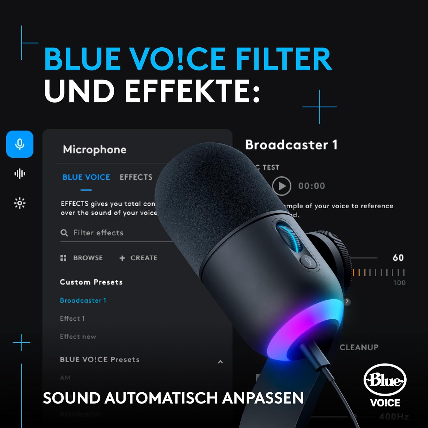 • Blue VO!CE филтри и ефекти: Активирайте интелигентно заключване на звука и други студийни инструменти; използвайте Blue VO!CE филтри, ефекти и семпли, за да забавлявате и да взаимодействате с вашата стрийминг аудитория.