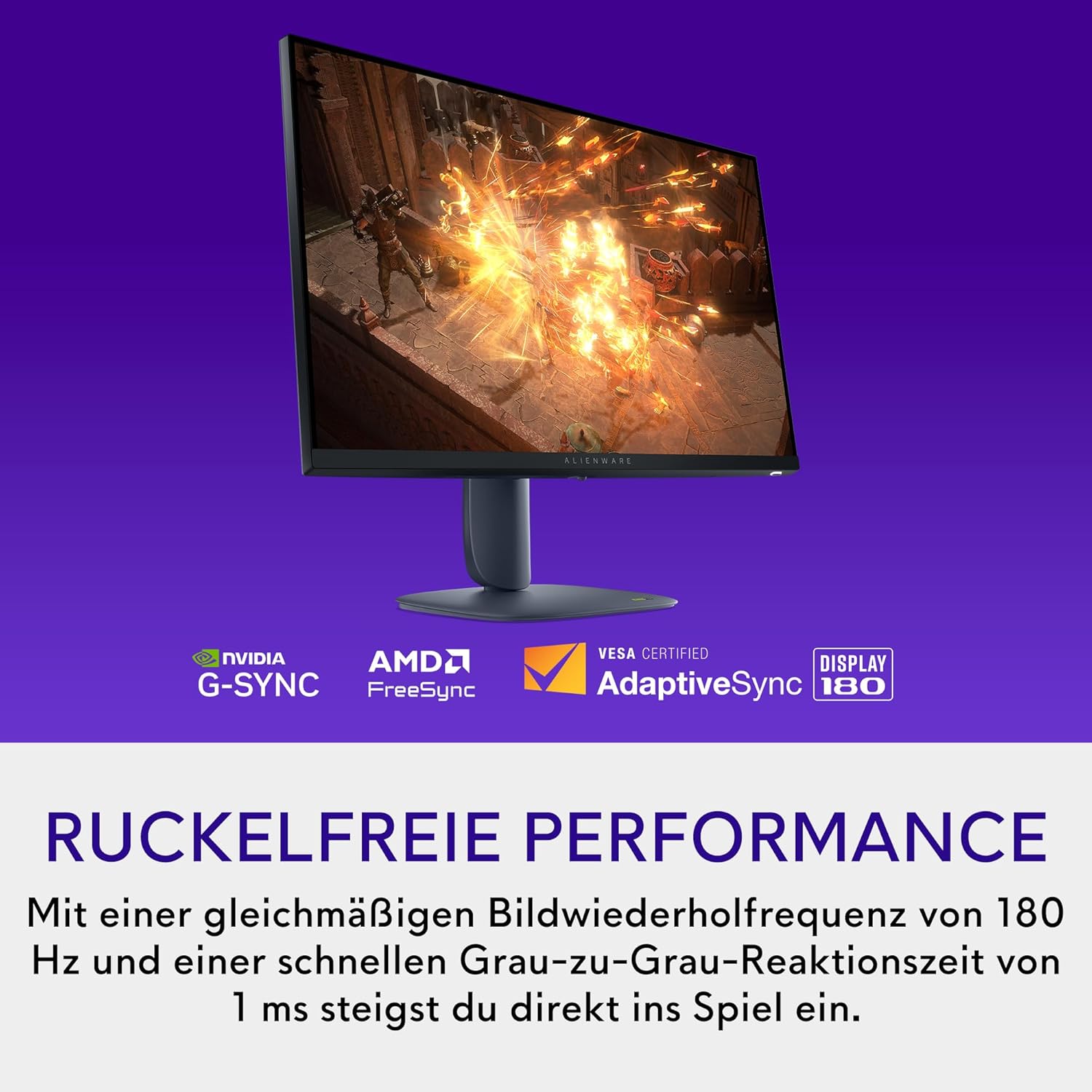 Геймърски монитор Alienware 27 - AW2725DM, QHD (2560 x 1440), 180Hz, бърза IPS матрица, 1ms, съвместим с NVIDIA G-SYNC, AMD FreeSync, 95% DCI-P3, HDR400, DisplayPort, 2 HDMI, 3 USB, 3 години гаранция