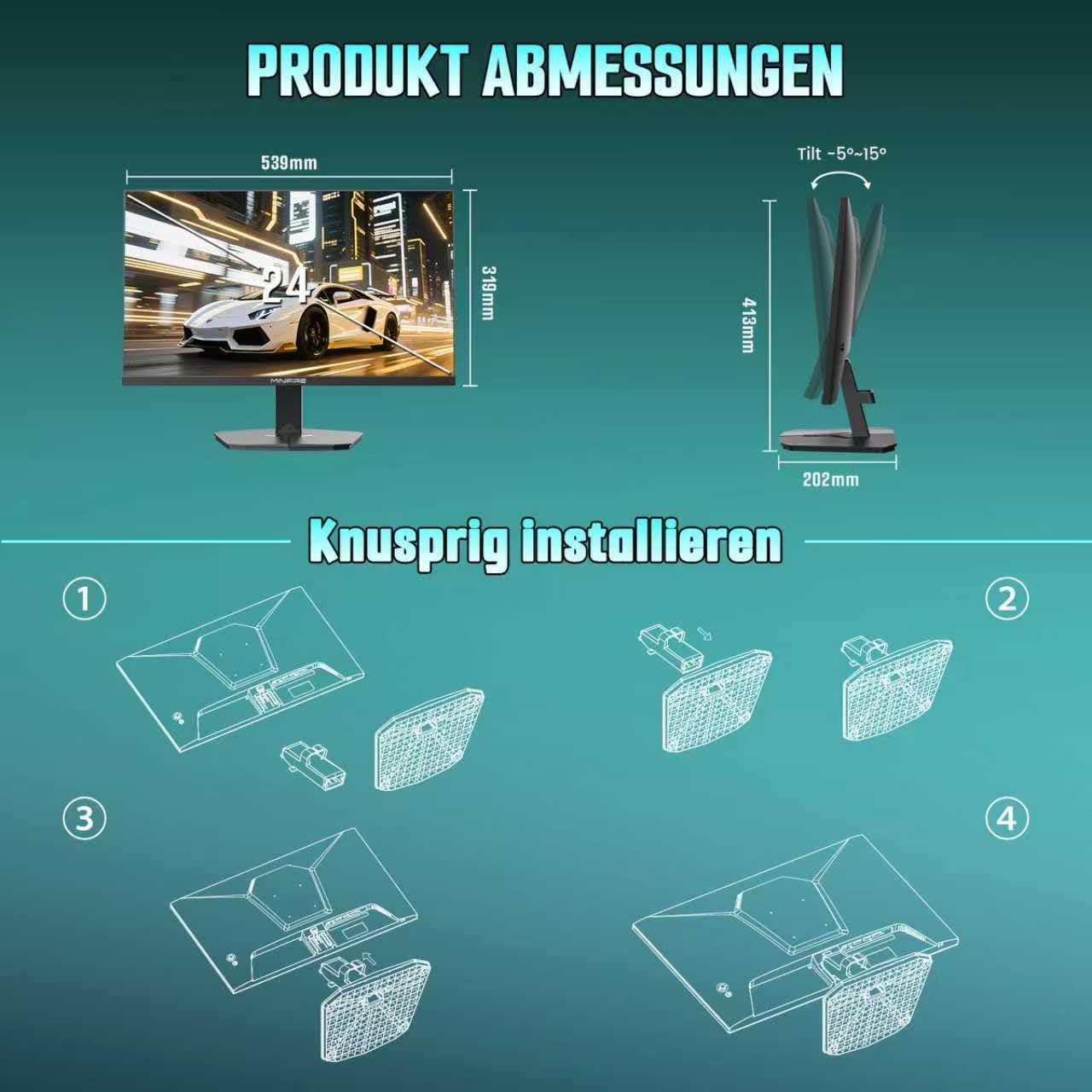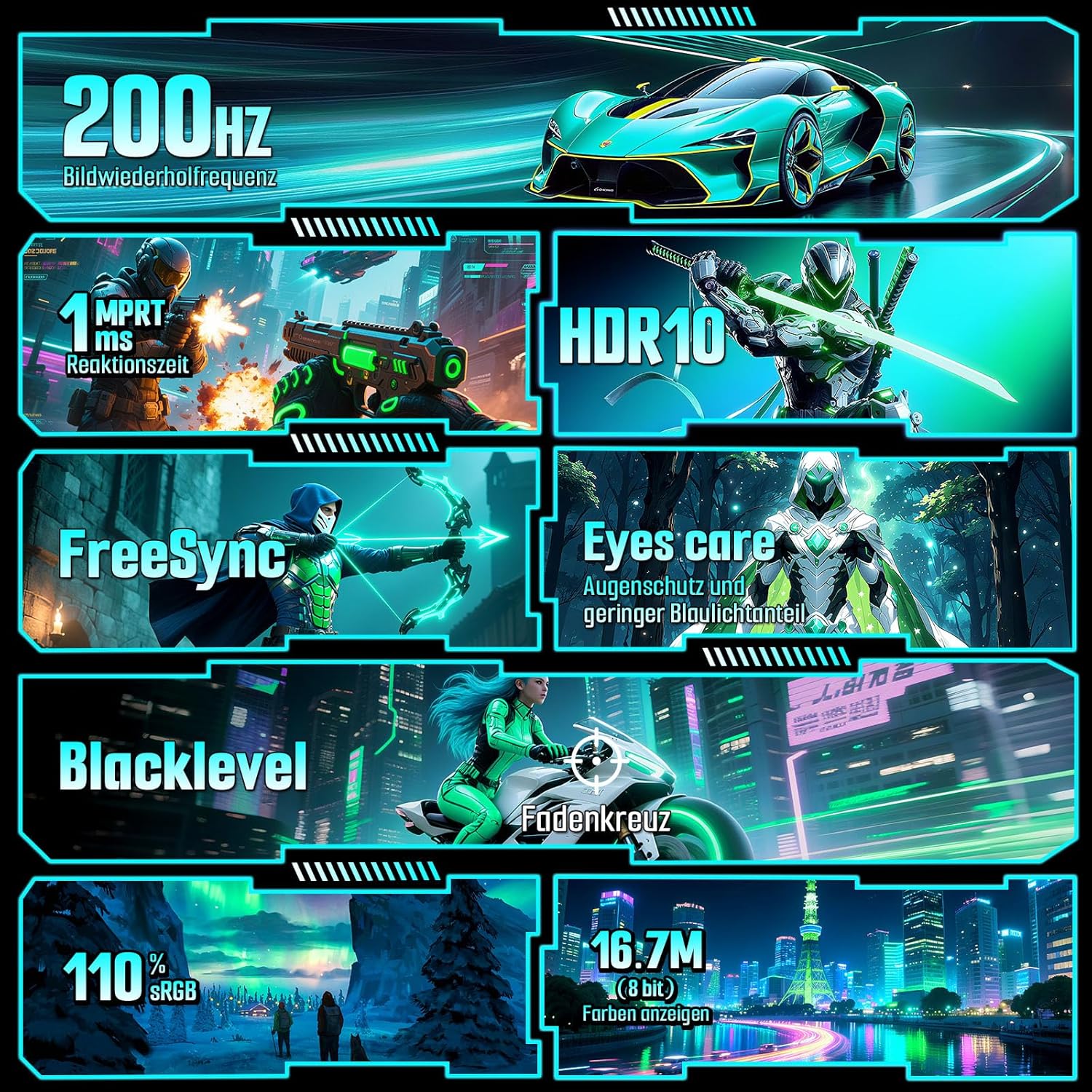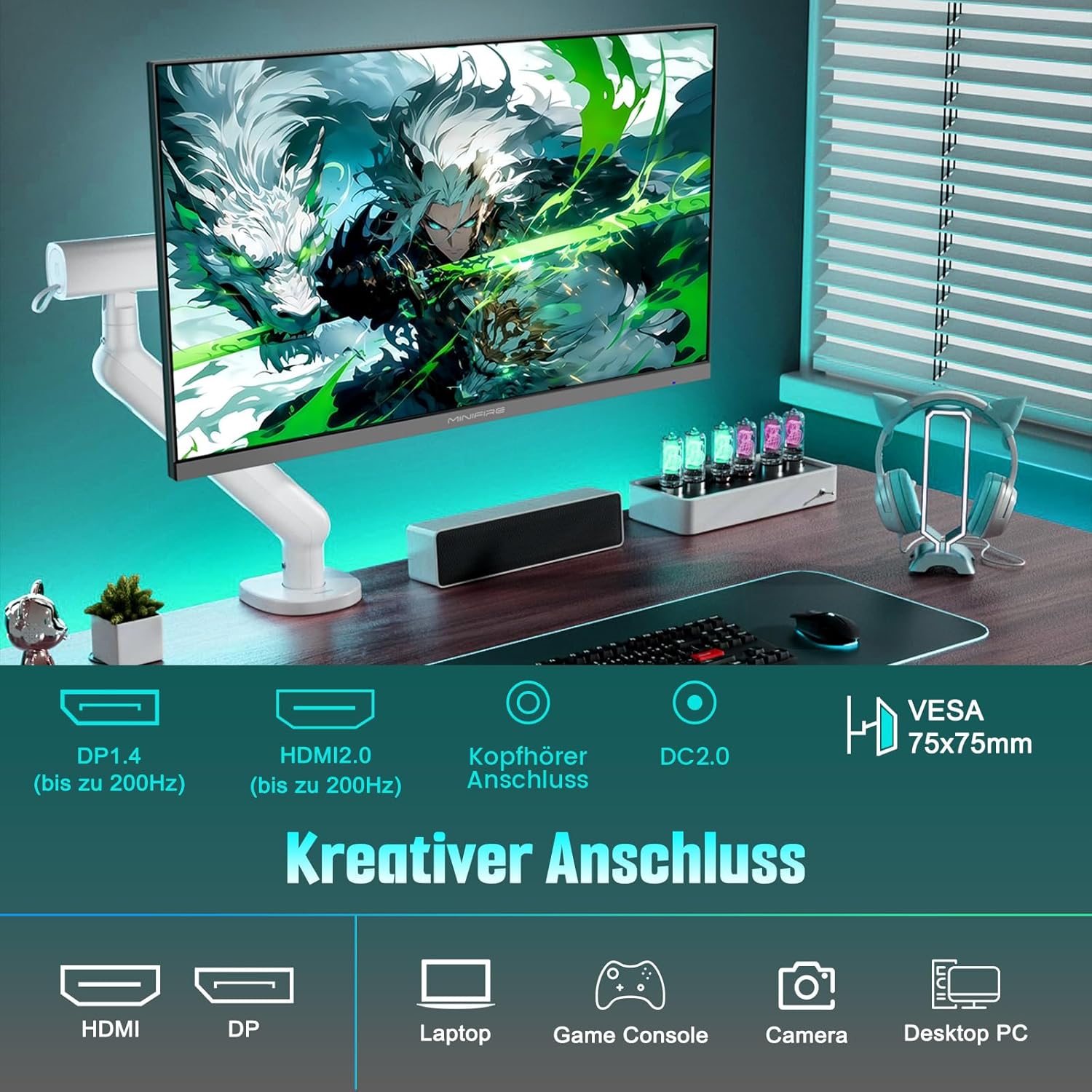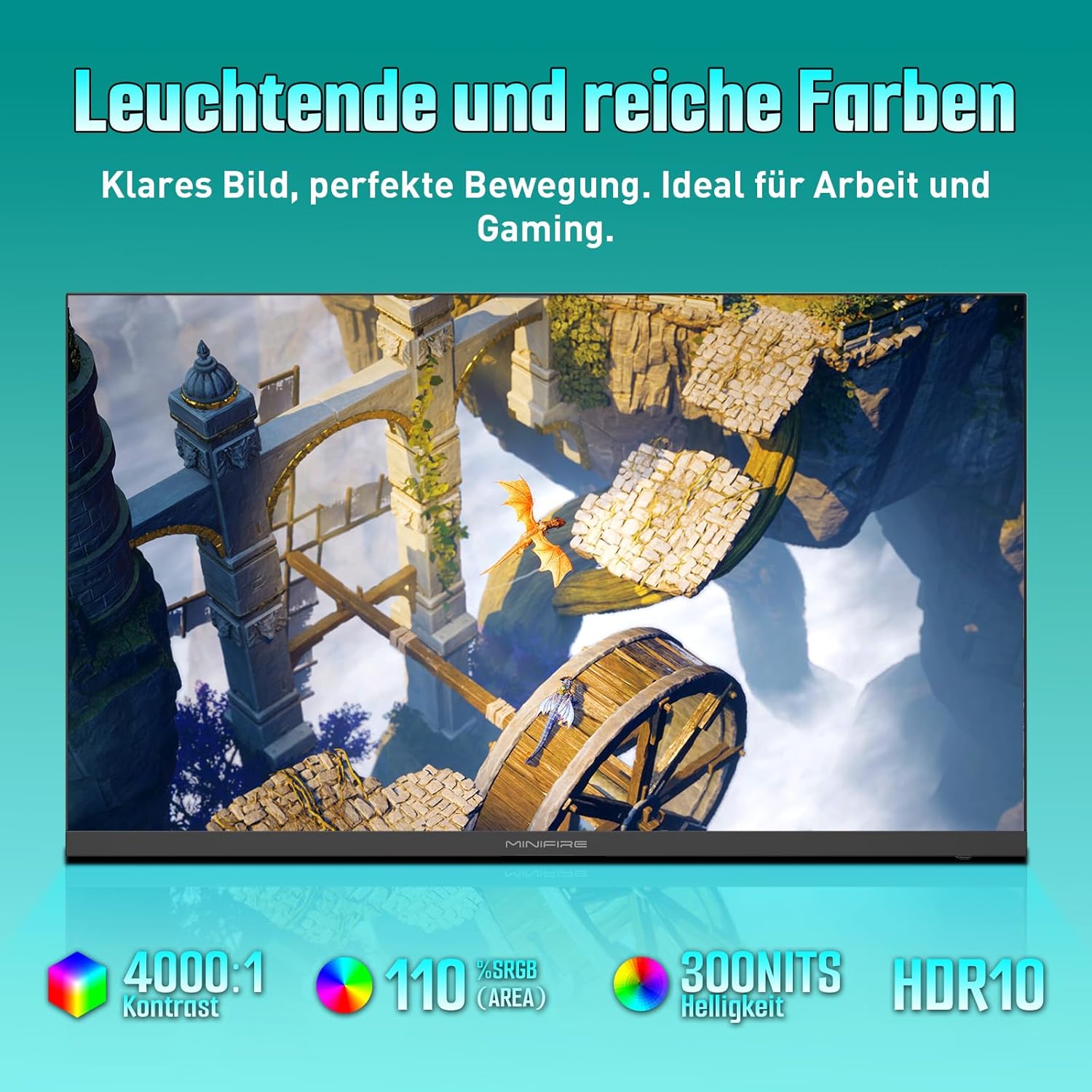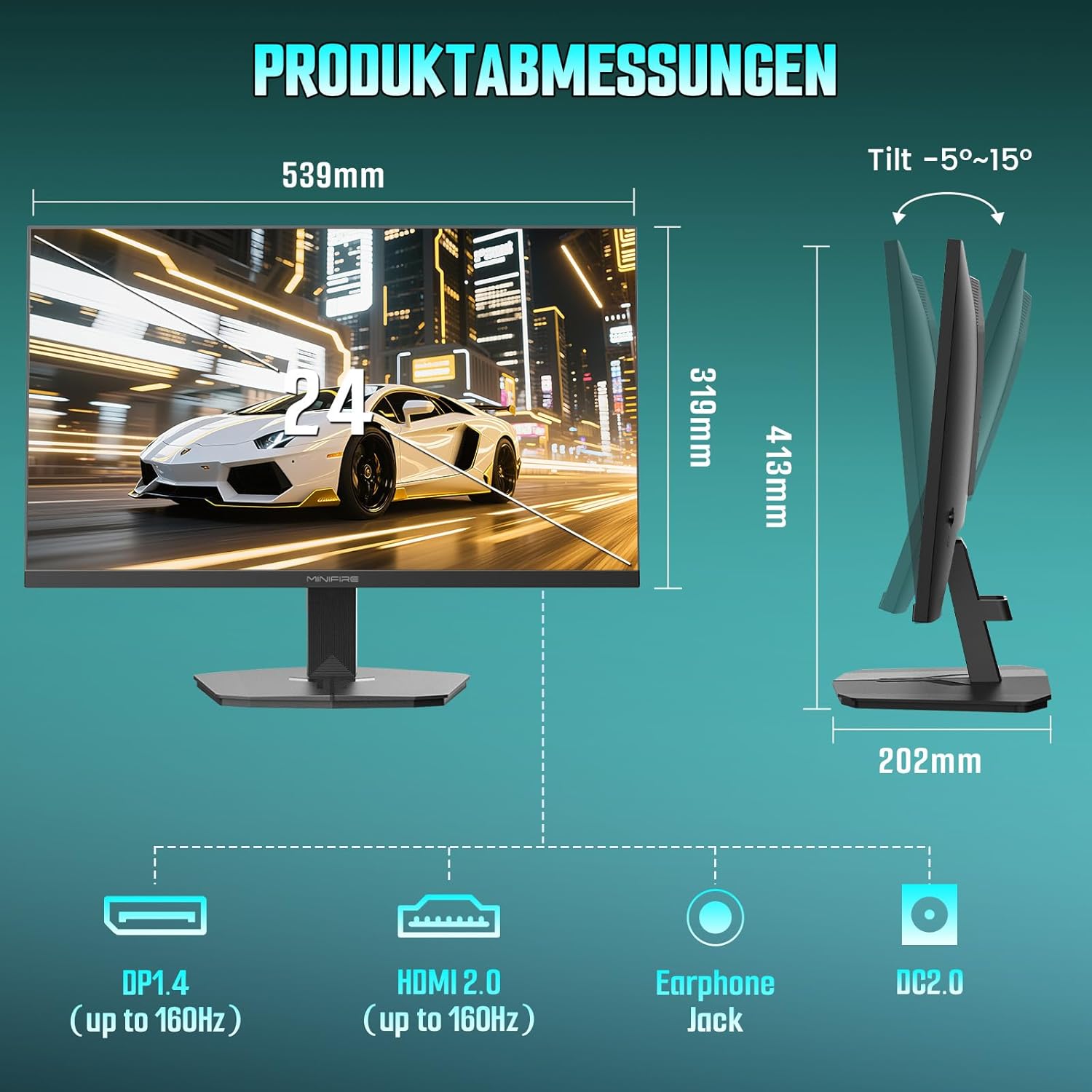 Геймърски монитор Minifire 24 инча, 200 Hz, 1 ms, FreeSync, Full HD (1920 x 1080), безрамков екран, регулируем, 300 нита, sRGB 110%, HDMI 2.0 и DP 1.4-(MFG24F4H)