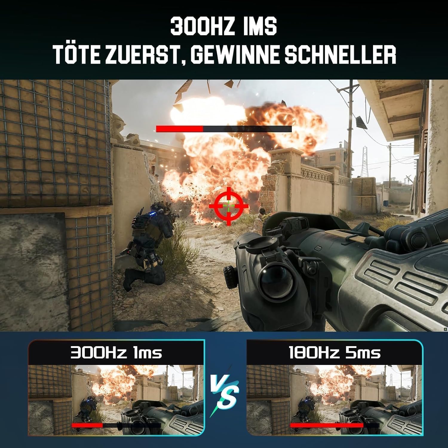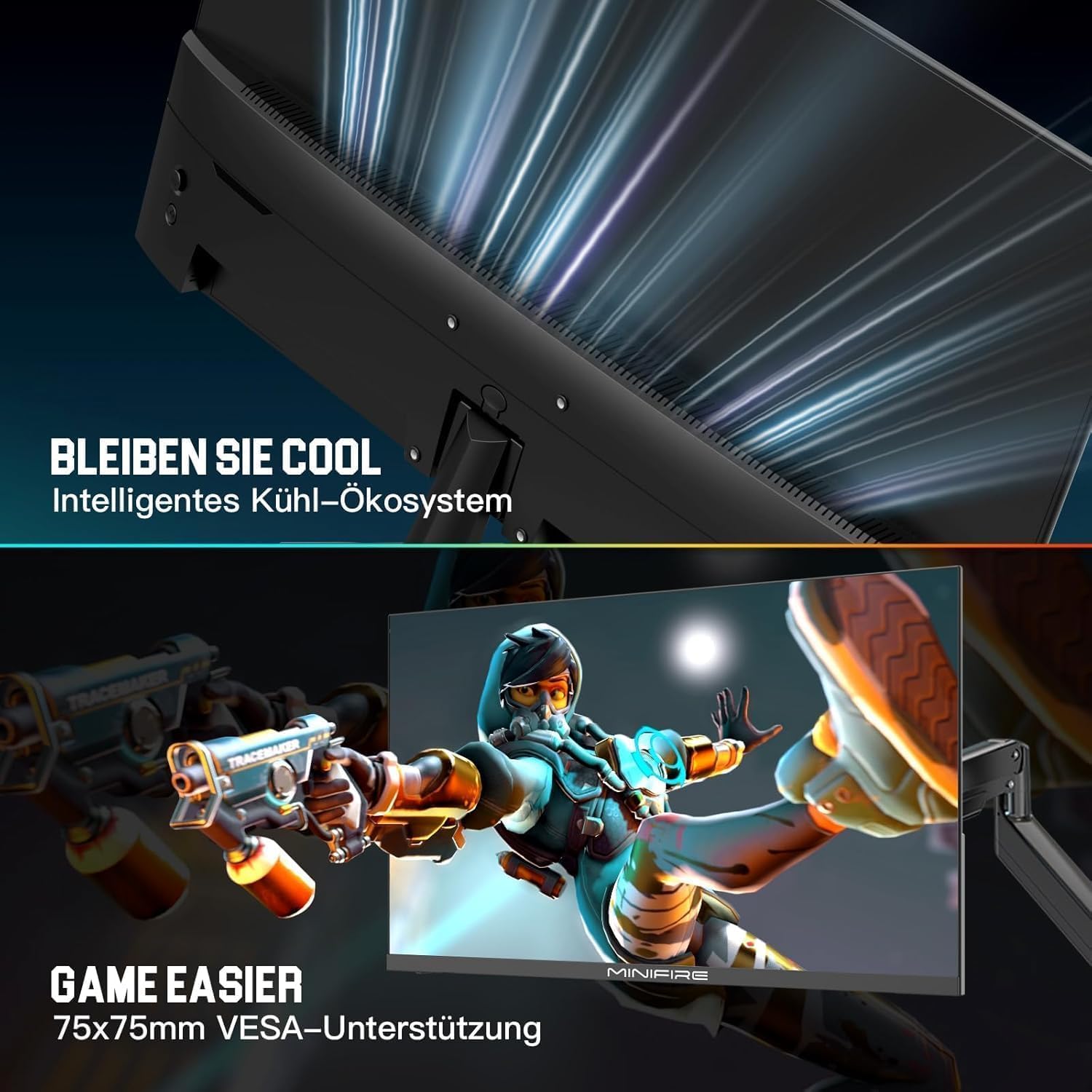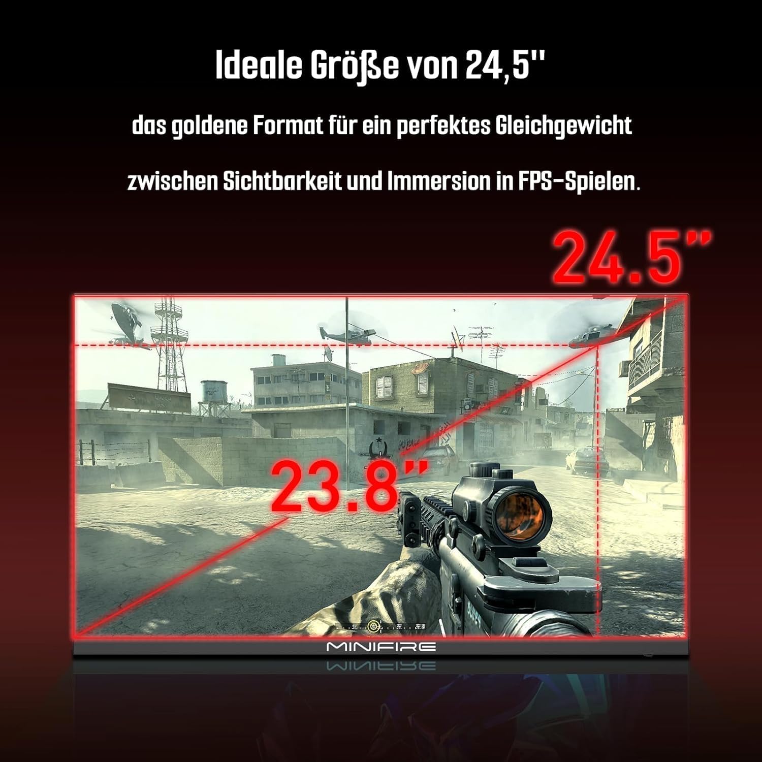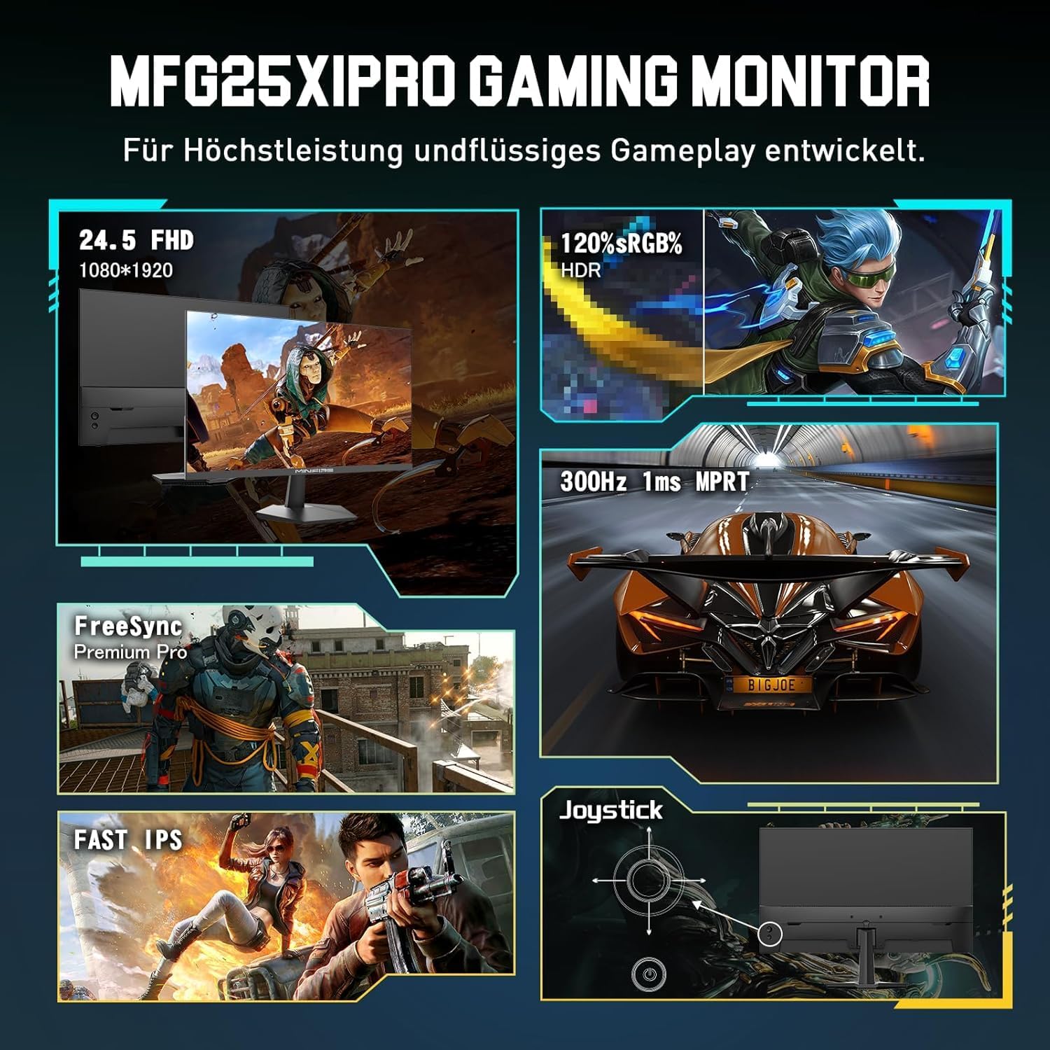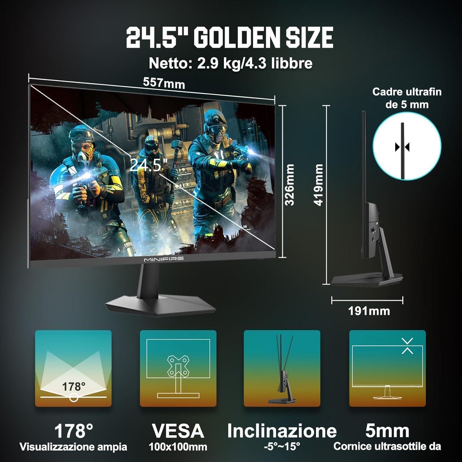 Геймърски монитор Minifire 24.5 инча, 300Hz, 1Ms, FHD 1080P, безрамков екран, FreeSync, IPS панел, HDR Ready, sRGB 120%, Eye-Care, HDMI 2.0 и DisplayPort 1.4, VESA 75 x 75, черен