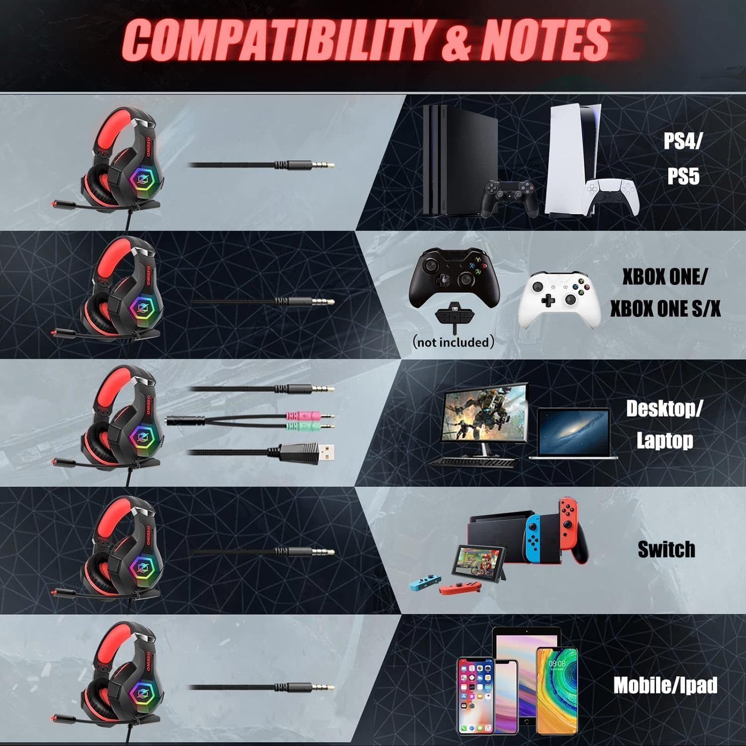 • 【Съвместим с множество платформи】Тези геймърски слушалки с 3,5 мм аудио жак са съвместими с PS4, PS5, PC, Xbox One, Xbox One S/X, лаптоп, Mac, PlayStation 3, таблети и телефони. Не е необходима настройка при свързване към PS4/PS5; просто включете и играйте. USB жакът захранва само RGB светлините.