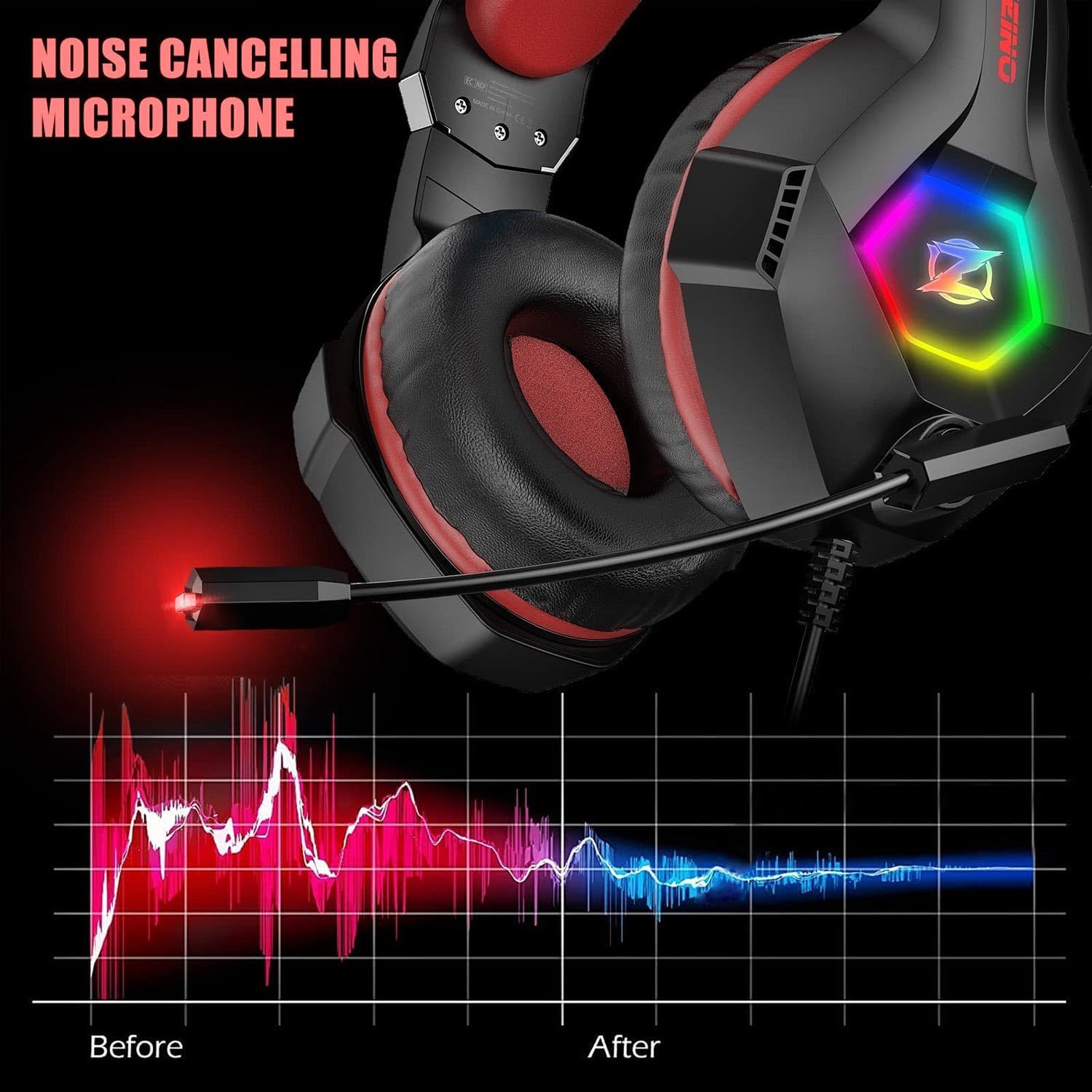 • 【Шумопотискащ микрофон】Микрофонът за геймърски слушалки използва най-новата технология за шумопотискане, за да елиминира шума и да предава висококачествена комуникация. Микрофонът може да се завърта на 120° и 360°, улавяйки звуци с висока чувствителност, което ви позволява да изпращате или получавате ясни съобщения без забавяне по време на игра.