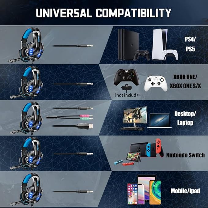 • 【Мощна съвместимост с платформи】Тези геймърски слушалки за PS4 са съвместими с всички устройства с 3,5 мм порт, поддържат PS4, PS5, Xbox One, PC, Mac, лаптоп, таблет, мобилен телефон и др. Когато се свързвате с PS4/PS5, просто включете и започнете. (Свързването с по-стара Xbox One изисква допълнителни адаптери)