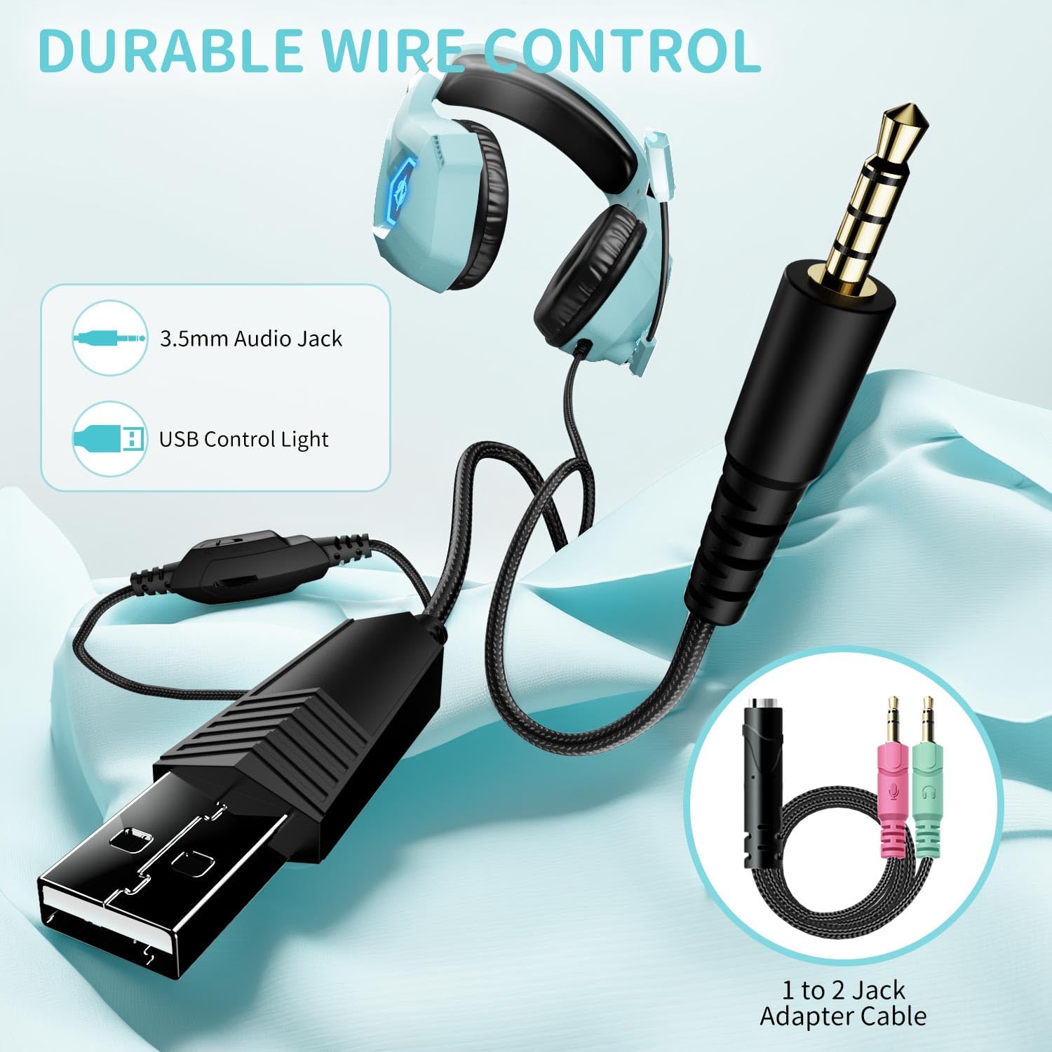 Геймърски слушалки Ozeino за PS5 PS4 Xbox One PC Switch, геймърски слушалки PS5 с микрофон, стерео звук и RGB светлина, небесно син