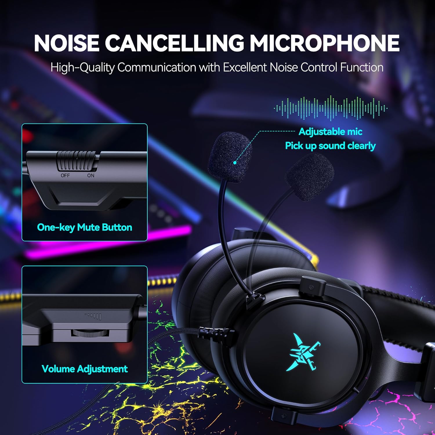 Геймърски слушалки TECKNET с кабел, 3.5 мм стерео съраунд звук, микрофон с шумопотискане и LED светлина, слушалки за уши за PC, PS4/PS5, Xbox Series, Switch, Mac и лаптоп