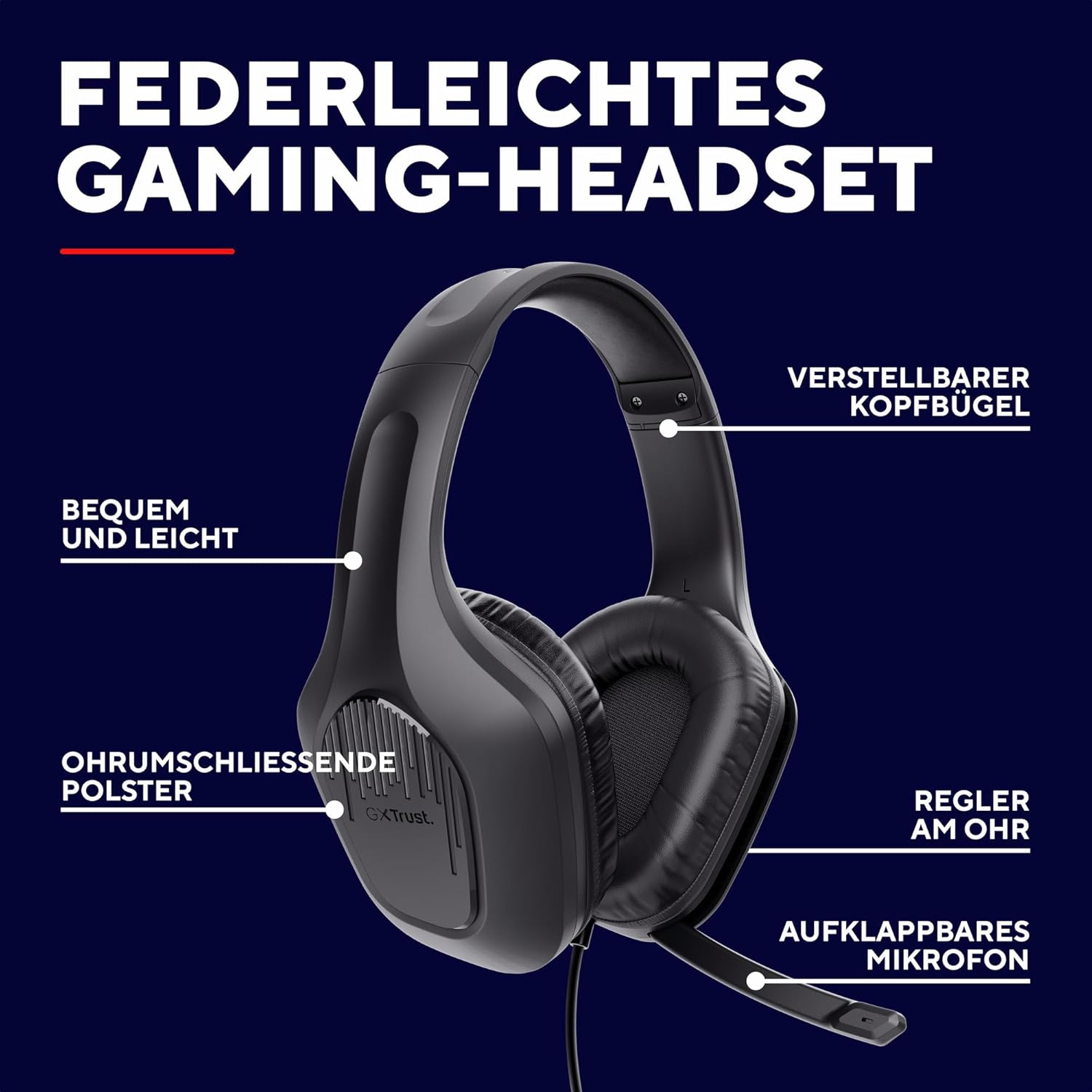 Геймърски слушалки Trust Gaming GXT 418 Rayne Lightweight за PC Xbox PS4 PS5 Switch Mobile, 50 мм драйвер, 2 м кабел, 3,5 мм аудио жак, слушалки с кабел, черни