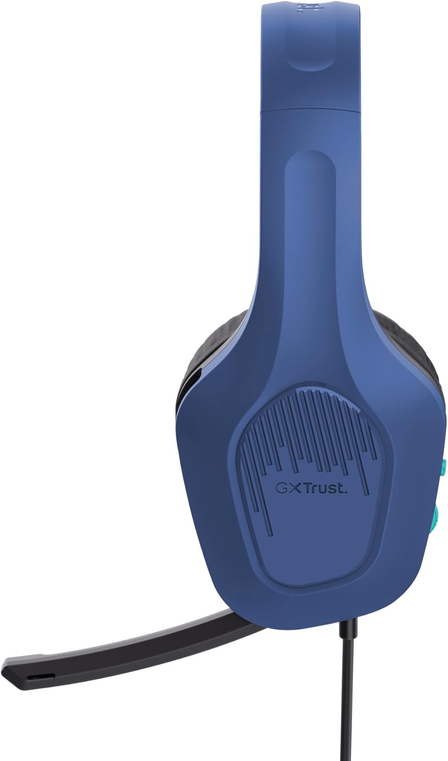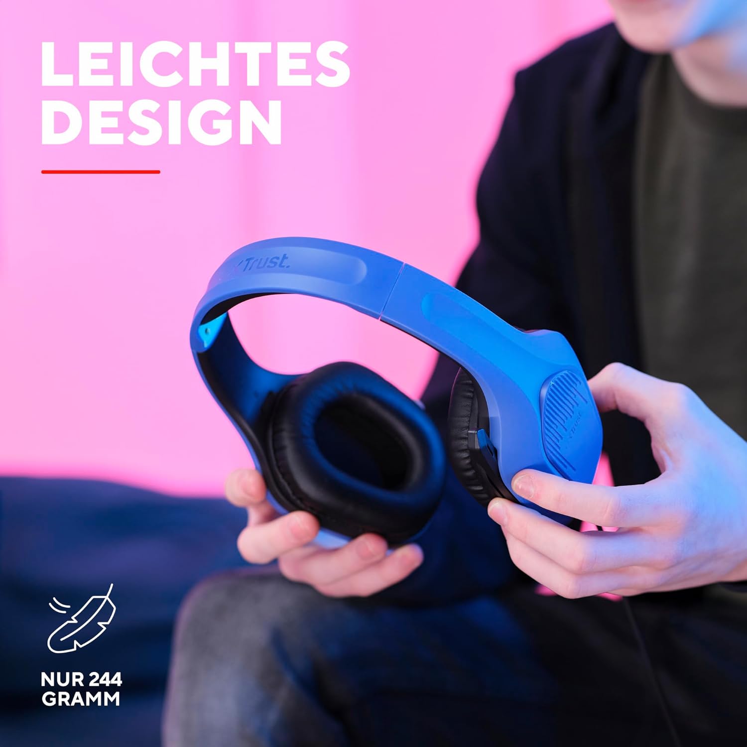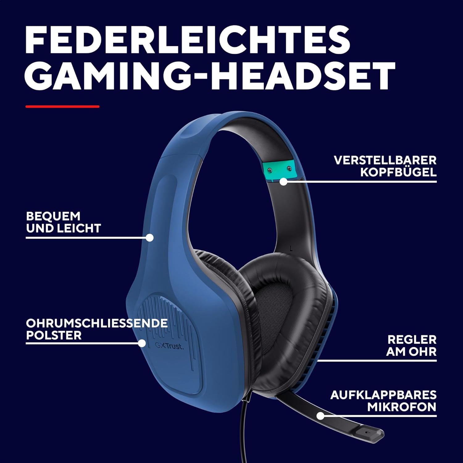Геймърски слушалки Trust Gaming GXT 418B Rayne Lightweight за PC Xbox PS4 PS5 Switch Mobile, 50 мм драйвер, 2 м кабел, 3,5 мм аудио жак, слушалки с кабел, син