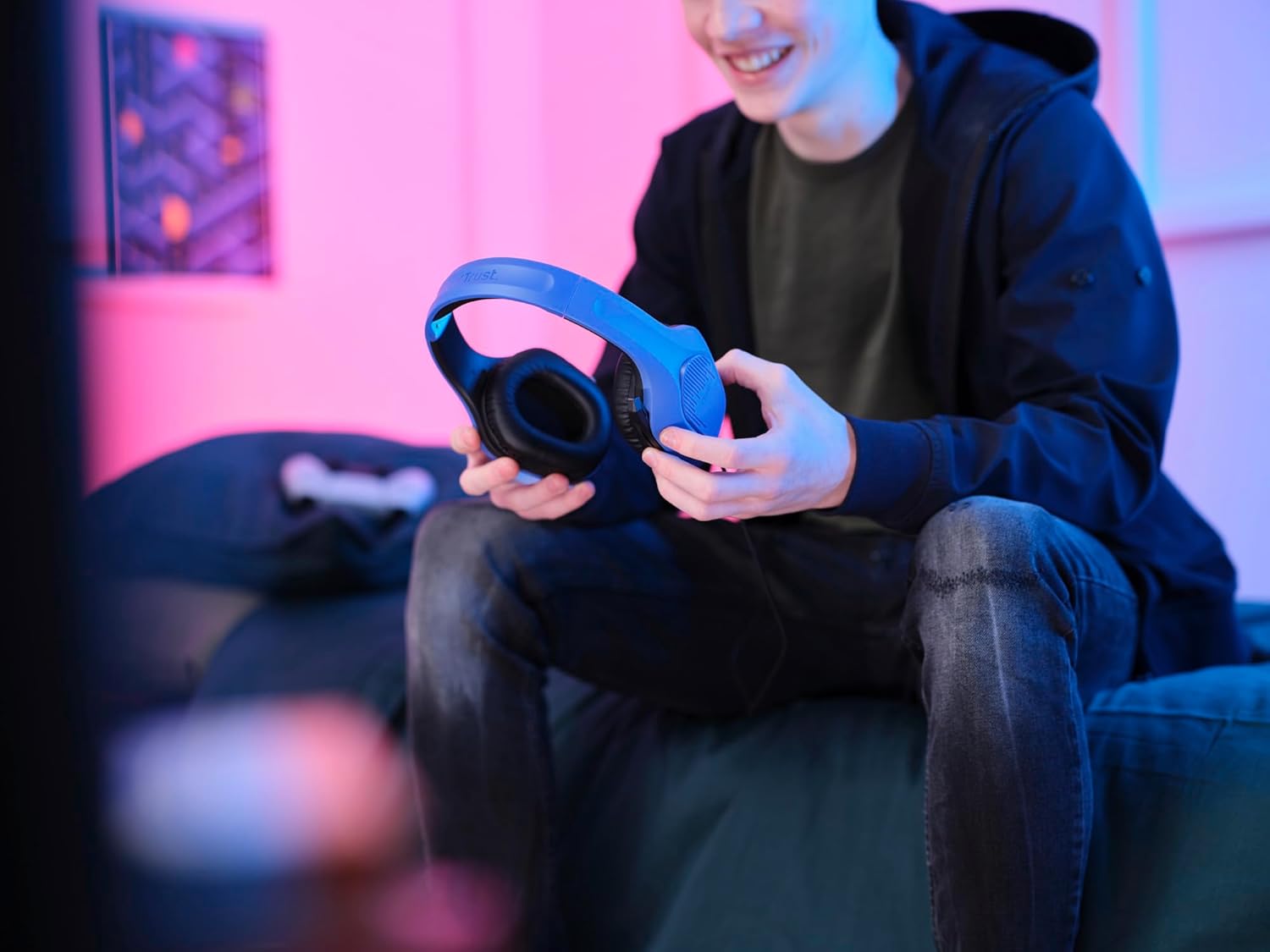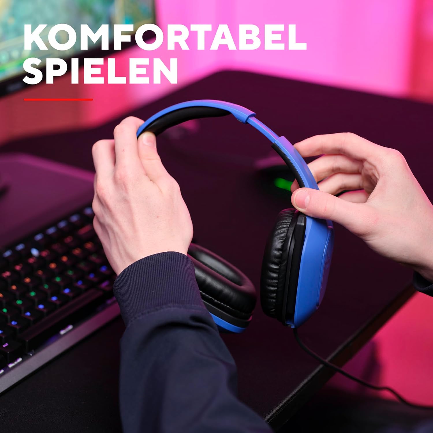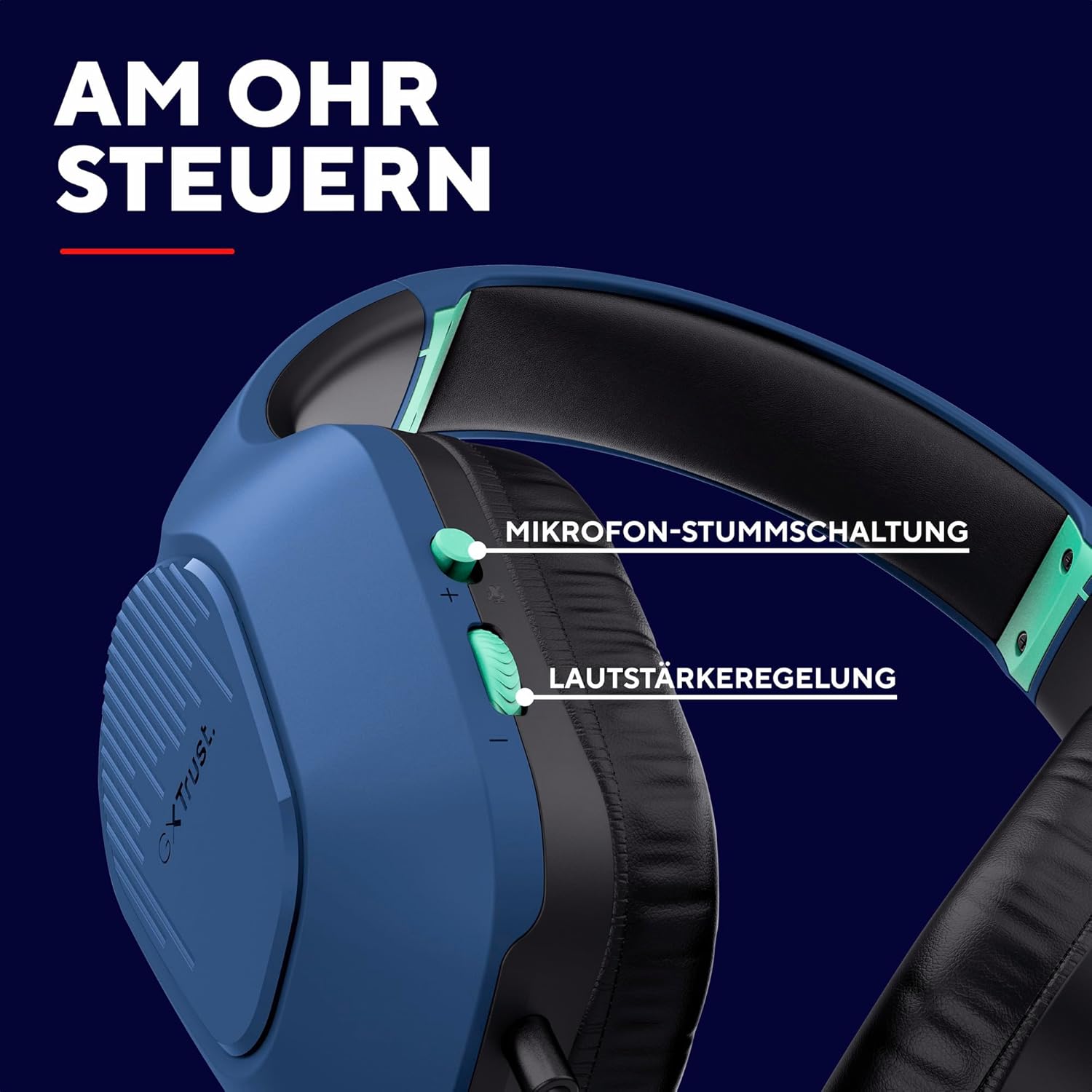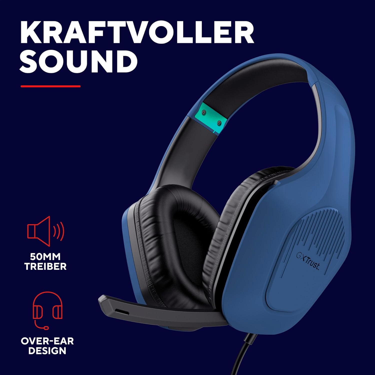 Геймърски слушалки Trust Gaming GXT 418B Rayne Lightweight за PC Xbox PS4 PS5 Switch Mobile, 50 мм драйвер, 2 м кабел, 3,5 мм аудио жак, слушалки с кабел, син