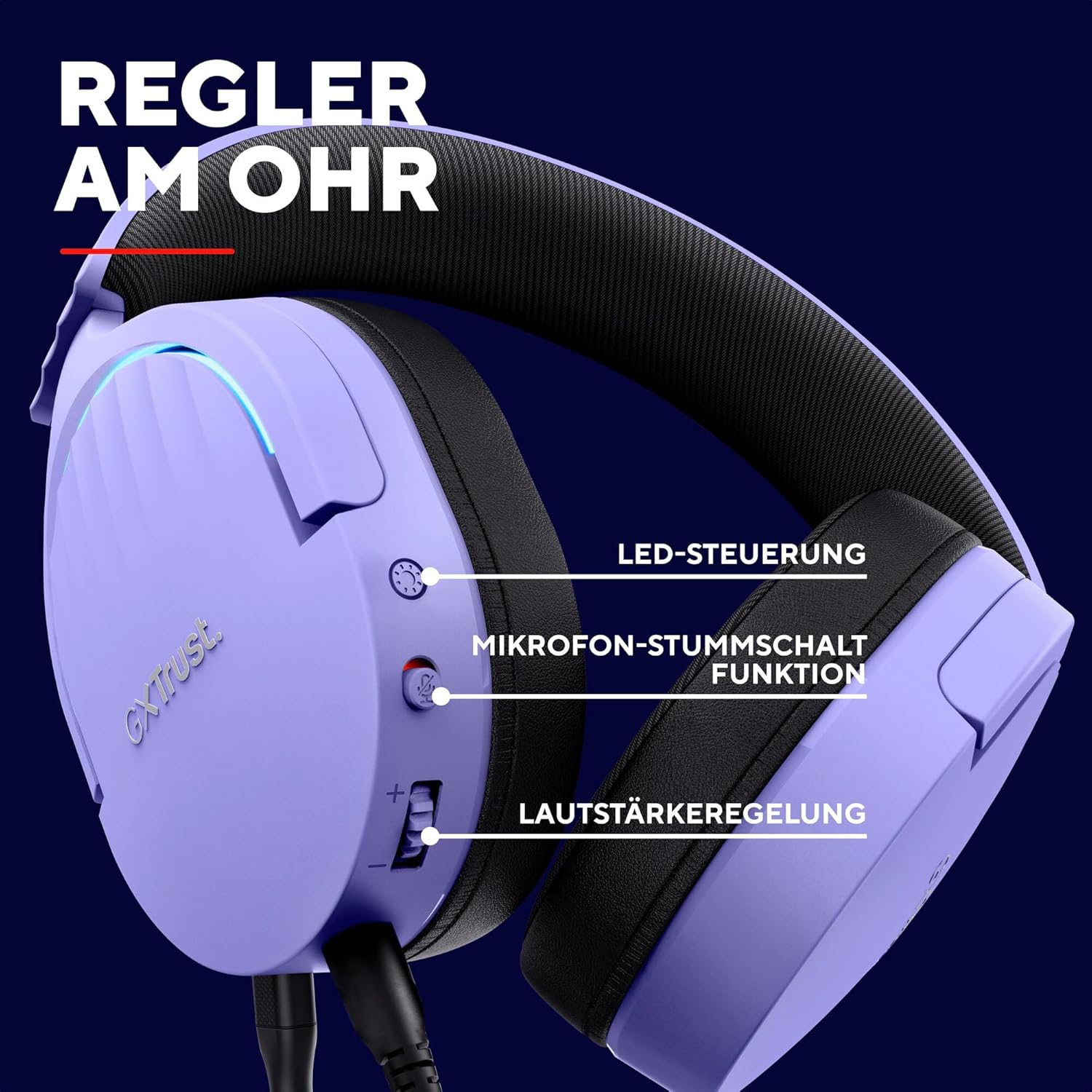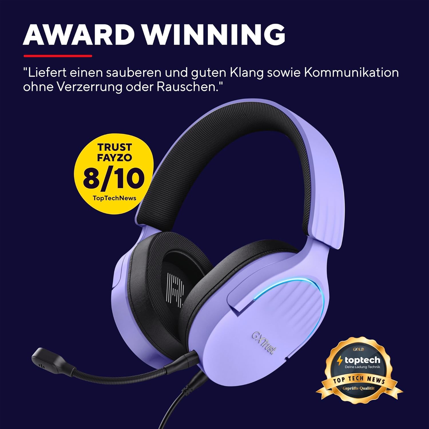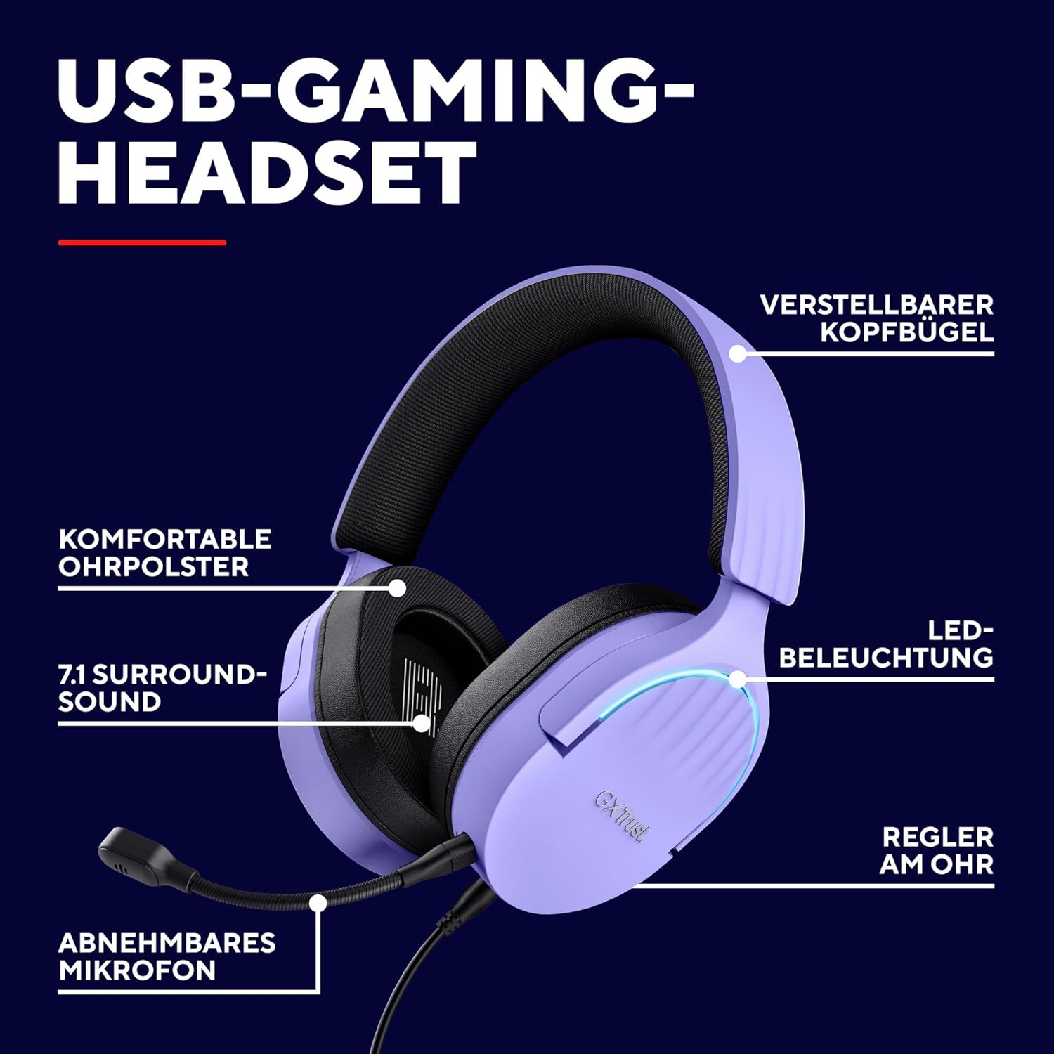 Геймърски слушалки Trust Gaming GXT 490P Fayzo 7.1 с USB съраунд звук, 50 мм драйвери, 2 м кабел, 35% рециклирана пластмаса, микрофон с шумопотискане, RGB слушалки за компютър - лилави