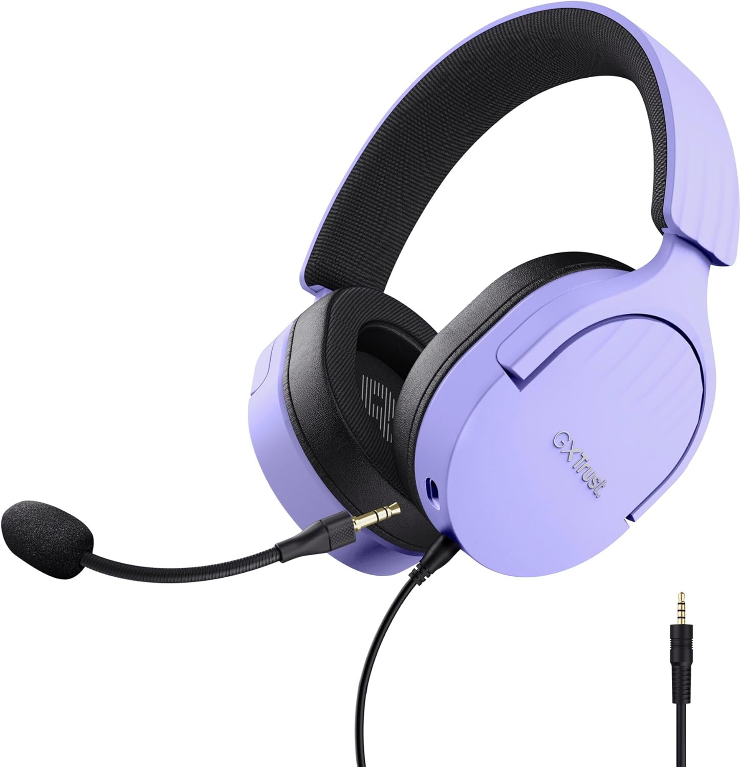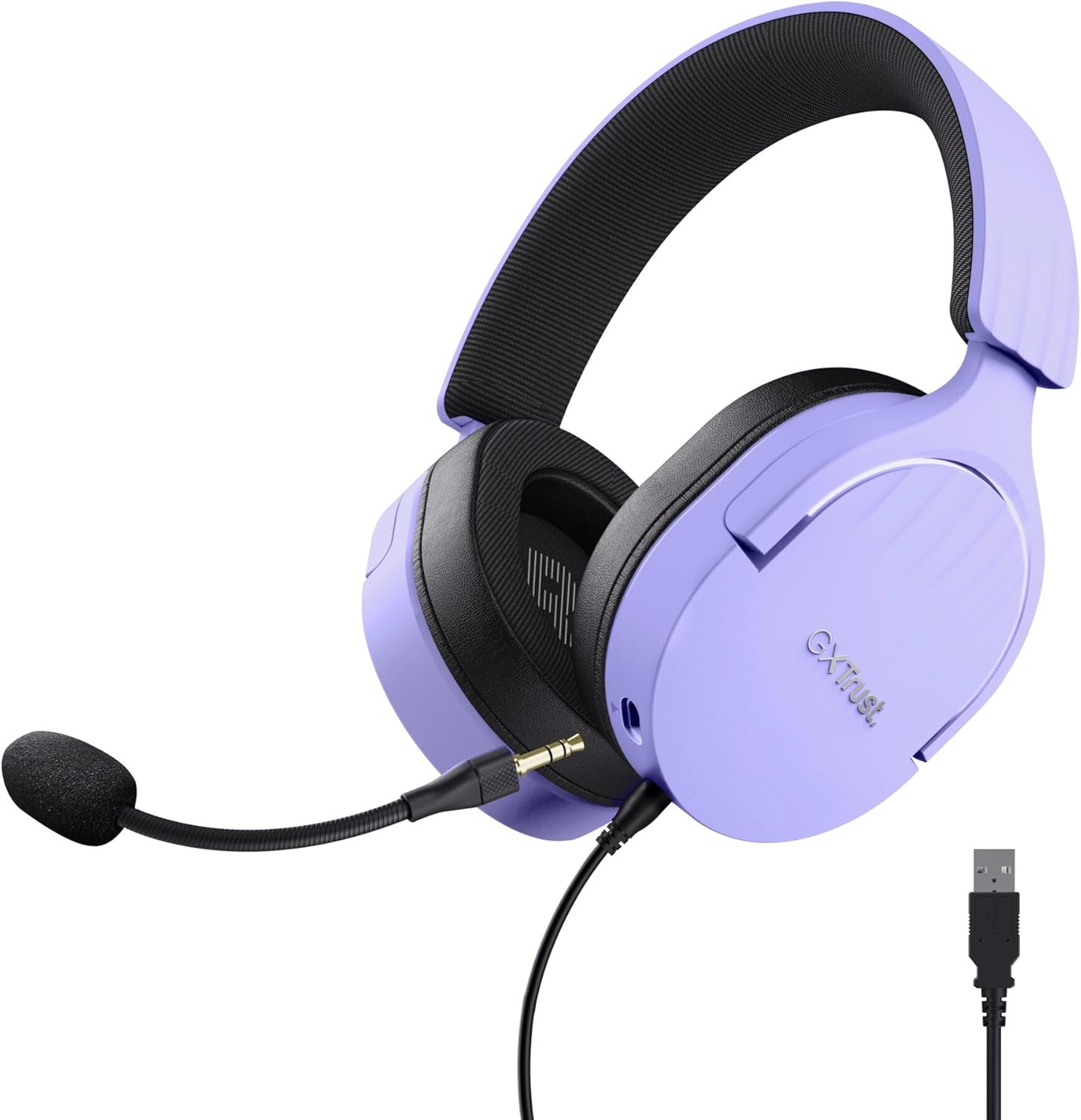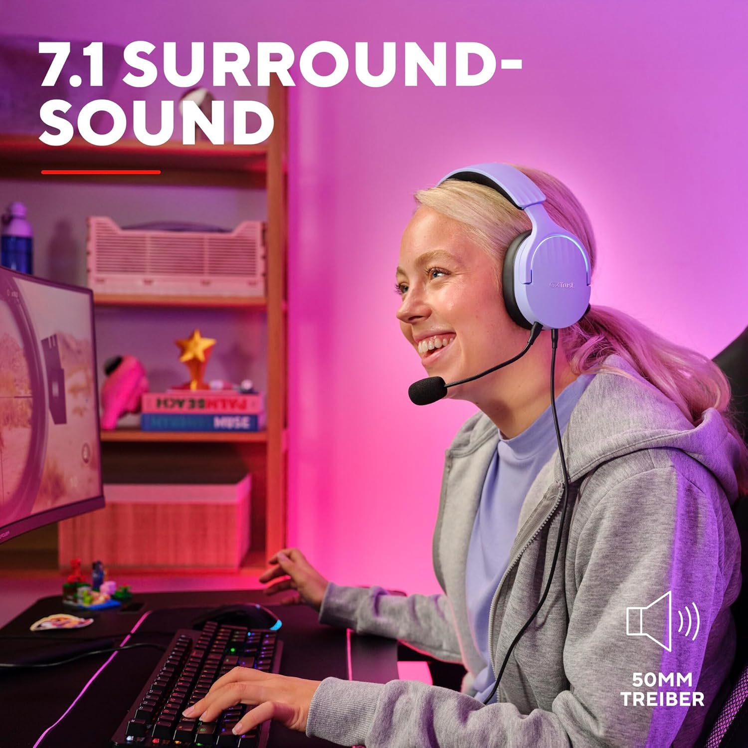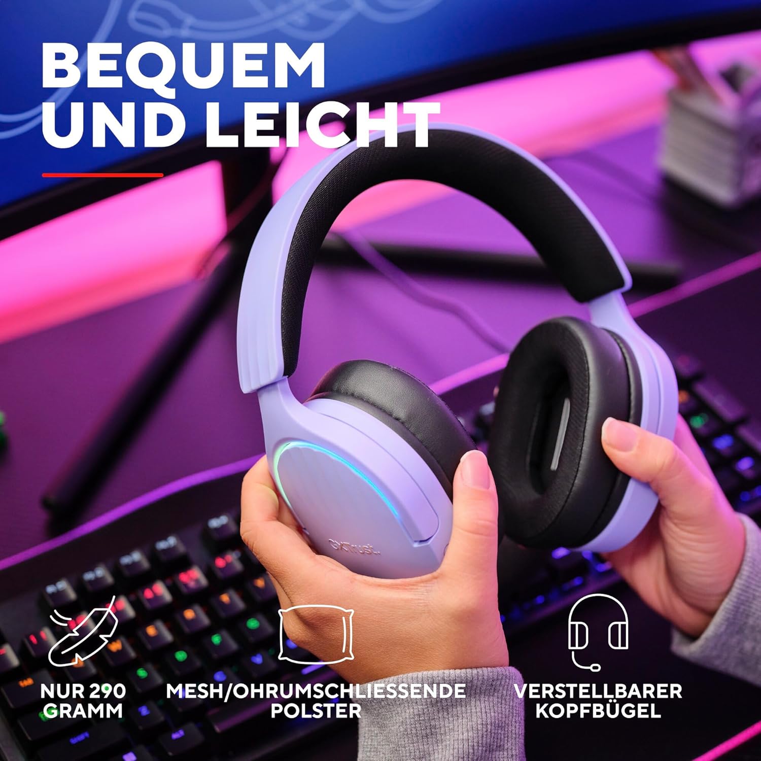 Геймърски слушалки Trust Gaming GXT 490P Fayzo 7.1 с USB съраунд звук, 50 мм драйвери, 2 м кабел, 35% рециклирана пластмаса, микрофон с шумопотискане, RGB слушалки за компютър - лилави